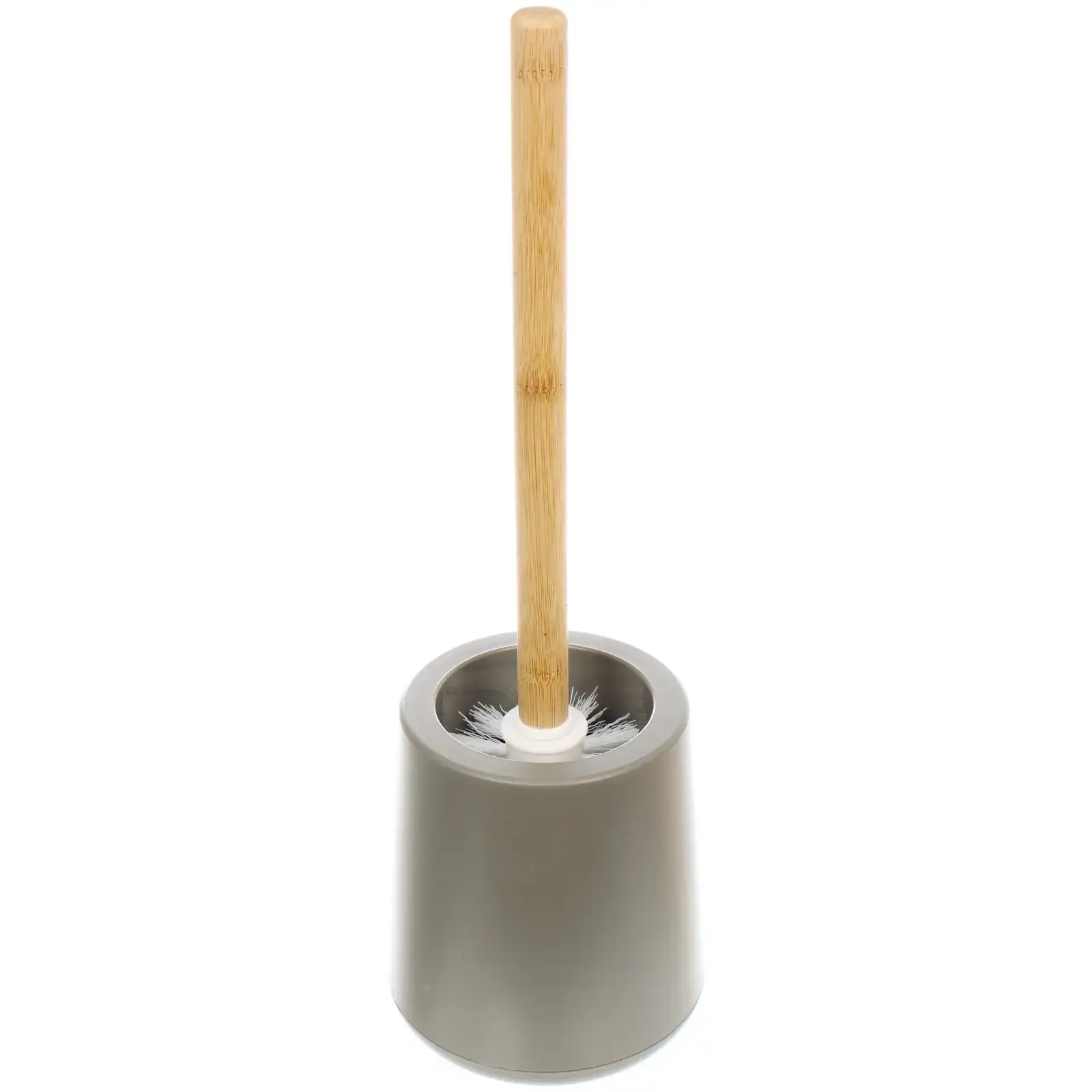 Ершик предназначен для поддержания чистоты унитаза и легко справляется с любыми загрязнениями. Его цилиндрическая форма и белые щетинки обеспечивают эффективную очистку, а деревянная ручка добавляет элегантности. Подставка выполнена из серого пластика и имеет гладкую текстуру, что делает ее не только практичной, но и стильной.