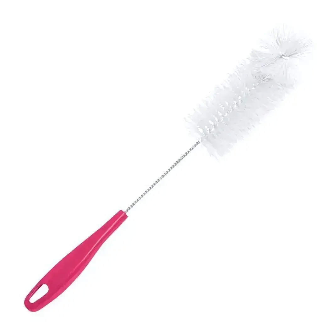 Розовая ручка длиной 20 см оптимальна для работы с тарой до 0,25 литра. Гибкое соединение щетины с металлической осью позволяет обрабатывать изогнутые поверхности. Белая синтетическая щетина сохраняет форму после многократного использования.