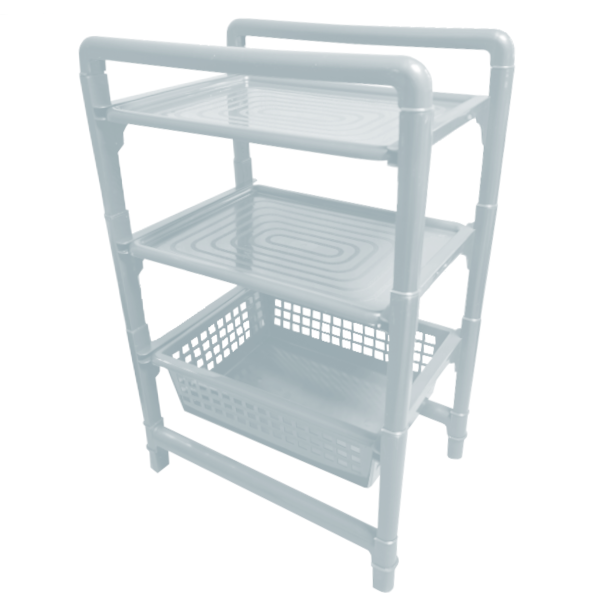 Этажерка изготовлена из пластика, что делает её устойчивой к влаге и простой в уходе. Поверхности легко очищаются от загрязнений, поэтому изделие отлично подходит для помещений с повышенной влажностью. Легкий вес конструкции позволяет при необходимости быстро переставить её в другое место. Рифленая поверхность полок помогает удерживать предметы и предотвращает их скольжение.