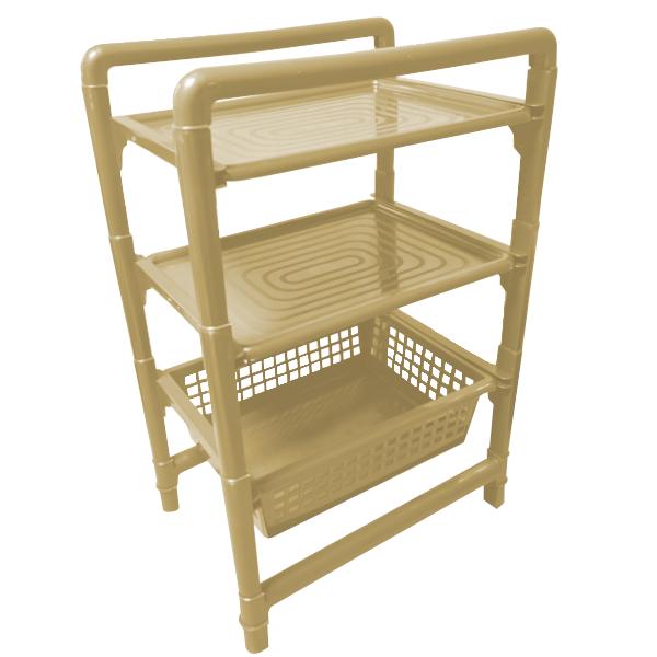 Две верхние полки подходят для размещения бытовых мелочей, посуды, косметики, бытовой химии или аксессуаров. Невысокие бортики по краям помогают удерживать предметы на месте. Нижний ярус выполнен в формате корзины с перфорацией, что удобно для хранения текстиля, упаковок и других вещей, которым важна вентиляция.