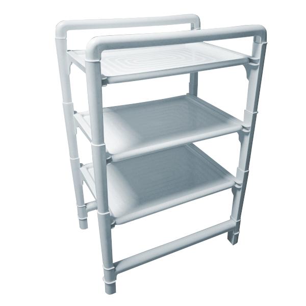Этажерка подходит для хранения посуды, банок и специй на кухне, косметики и бытовой химии в ванной, аксессуаров в прихожей или хозяйственных мелочей в кладовой. Открытая конструкция обеспечивает быстрый доступ к содержимому и хорошую вентиляцию. Три вместительные полки позволяют рационально распределить предметы по категориям.