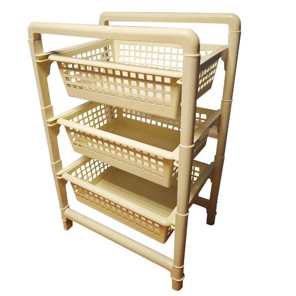 Модель оснащена тремя вместительными ящиками-корзинами, расположенными на разных уровнях. Перфорированные боковые стенки обеспечивают циркуляцию воздуха, что особенно удобно для хранения овощей, бытовых мелочей или текстиля. Сплошное дно предотвращает выпадение содержимого, а верхняя ручка позволяет легко перемещать этажерку при необходимости.