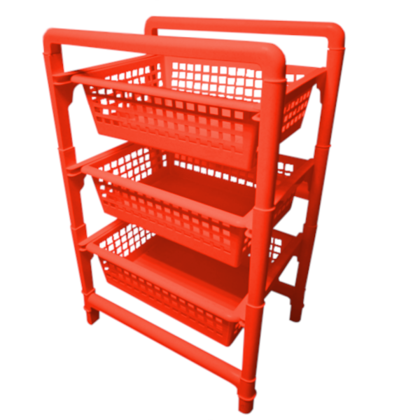 Конструкция состоит из устойчивого каркаса и трех вместительных корзин, расположенных одна над другой. Перфорированные стенки обеспечивают циркуляцию воздуха, что особенно удобно для хранения овощей, бытовой химии, текстиля или хозяйственных принадлежностей. Этажерка подходит для размещения в узких пространствах между мебелью или у стены.