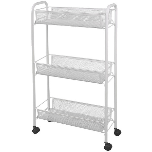 Этажерка имеет три уровня, что позволяет эффективно использовать вертикальное пространство. Корзины имеют прямоугольную форму и расположены друг над другом, что обеспечивает удобный доступ к содержимому. Металлическая рама с закругленными углами добавляет безопасности и предотвращает травмы при использовании.