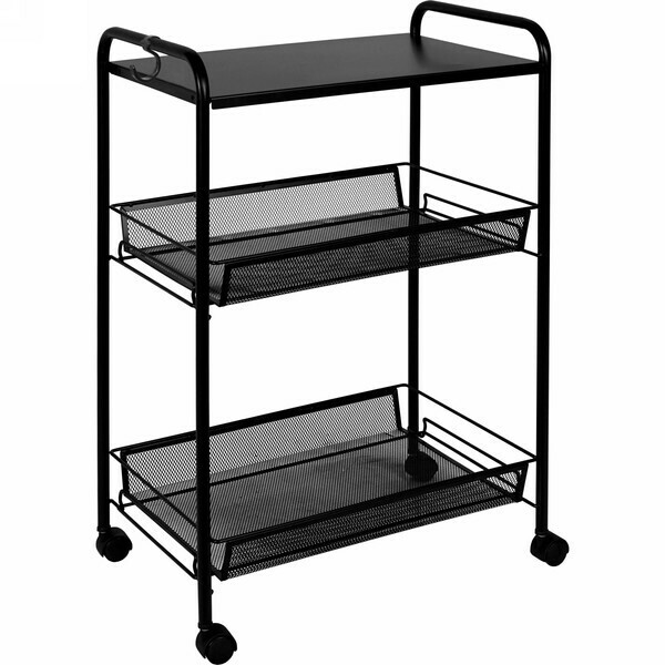 Этажерка подходит для хранения кухонных принадлежностей, книг, офисных материалов и других вещей. Пластиковые колеса обеспечивают легкость перемещения, а металлический столик на верхнем ярусе позволяет удобно размещать предметы, которые всегда должны быть под рукой. Увеличенное расстояние между нижними корзинами позволяет хранить высокие предметы, что делает ее еще более практичной.