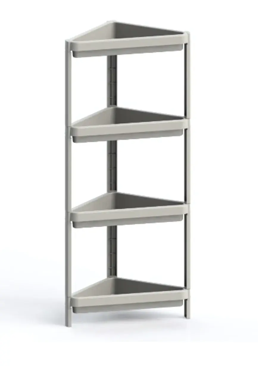 Этажерка состоит из четырех открытых полок, что позволяет удобно размещать на ней различные предметы — от книг до декоративных элементов. Благодаря треугольной форме полок, вы сможете максимально использовать угол комнаты, не жертвуя при этом стилем. Конструкция стеллажа выполнена из легкого и прочного пластика, что делает его простым в уходе и долговечным в использовании.