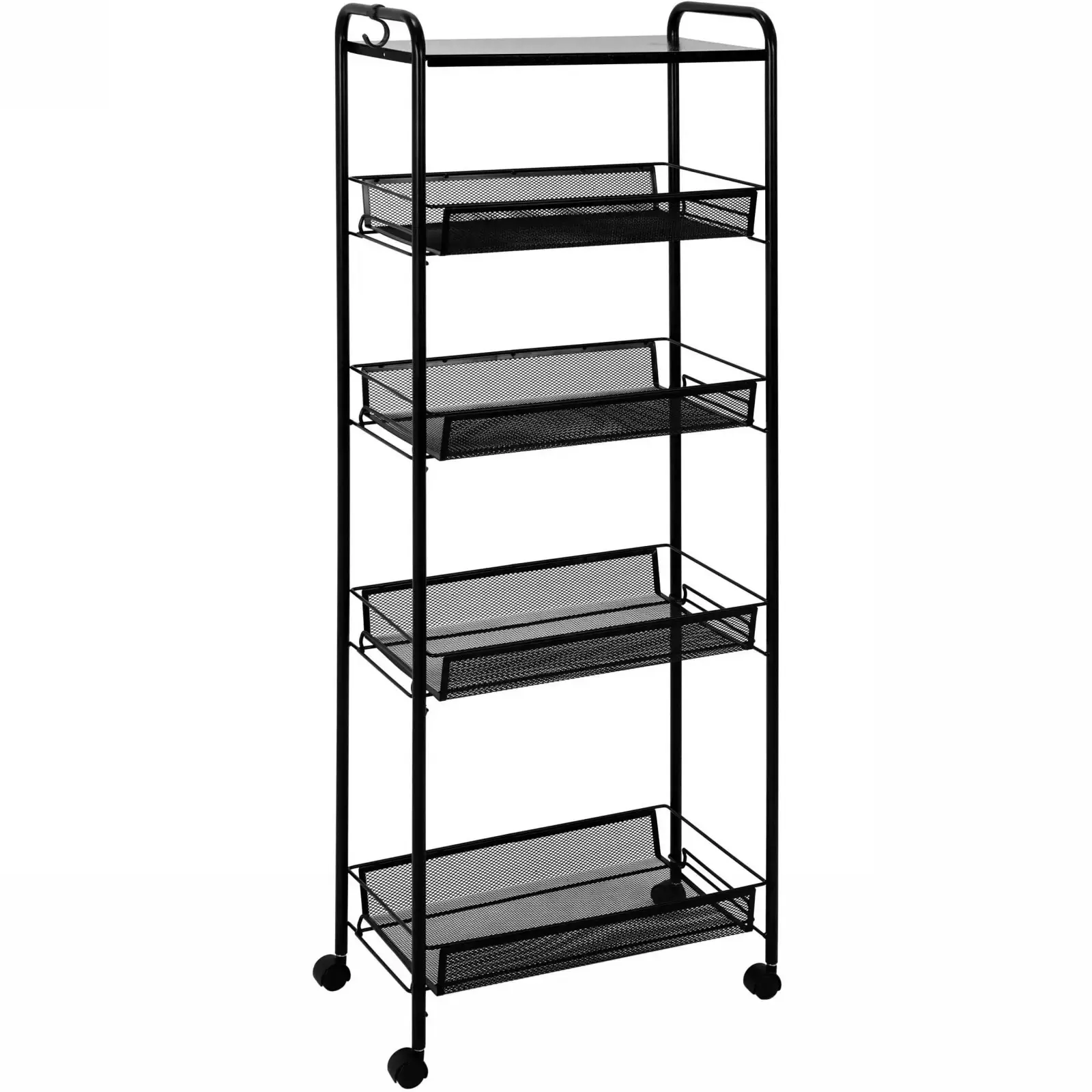 Этажерка оснащена четырьмя широкими корзинами, которые идеально подходят для хранения различных предметов — от книг и аксессуаров до бытовых принадлежностей. Увеличенное расстояние между нижними корзинами позволяет размещать высокие предметы, что добавляет дополнительную практичность. Металлический столик на верхнем ярусе предоставляет дополнительное пространство для мелочей.