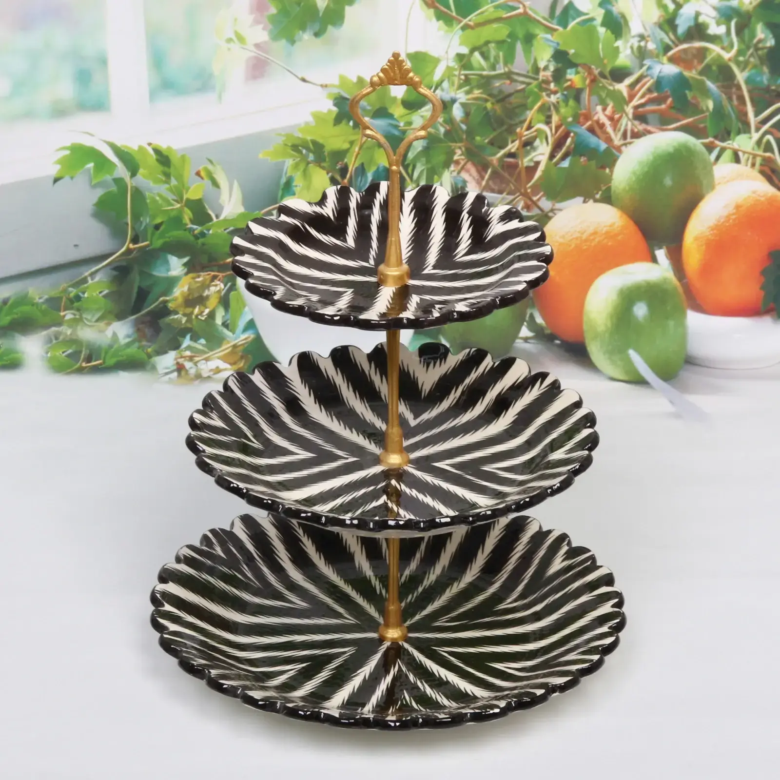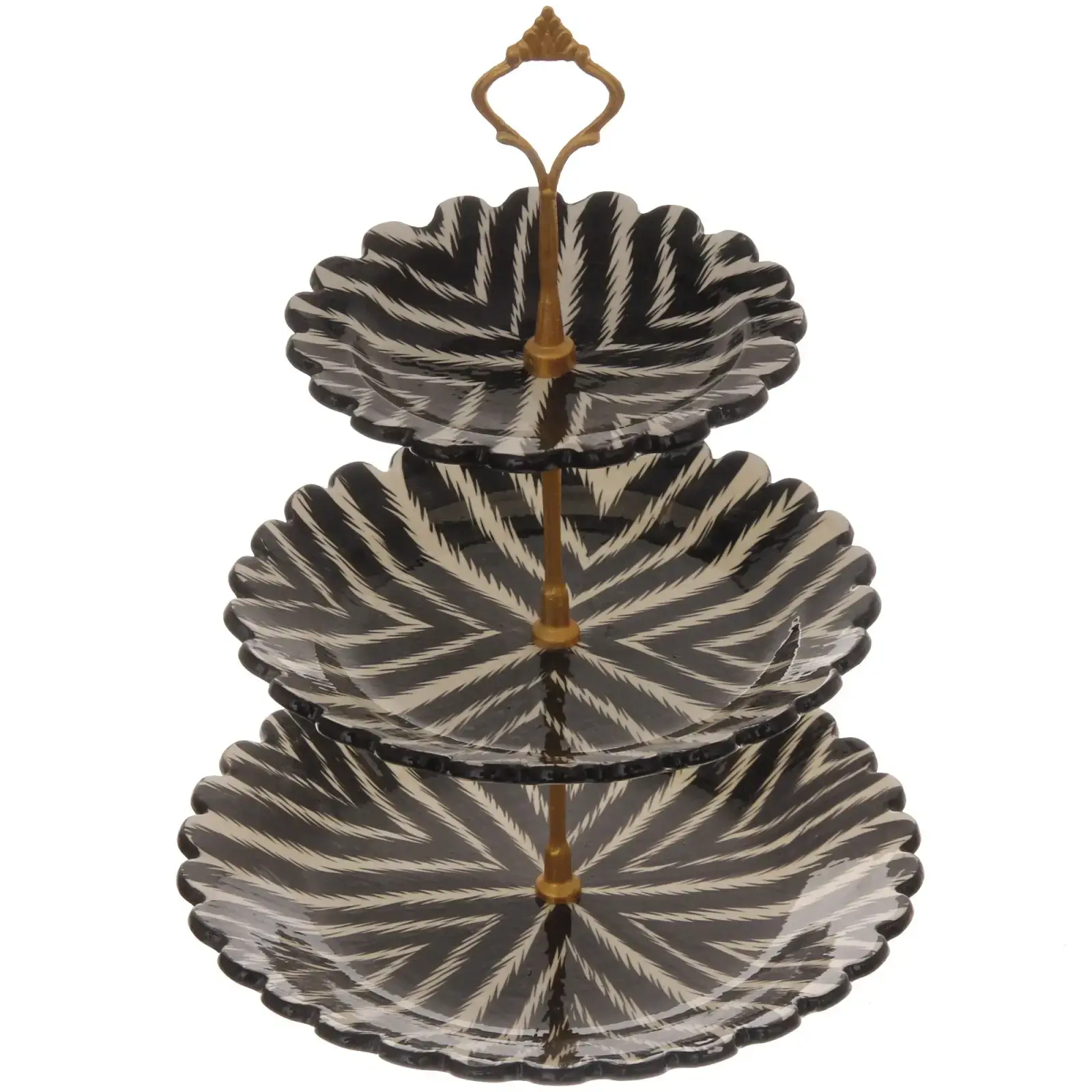 Этажерка имеет три круглые тарелки, которые удобно располагаются одна над другой, позволяя экономить место на столе. Центральная золотистая ручка обеспечивает легкость переноса, что делает её идеальной для сервировки на мероприятиях. Благодаря волнистым краям и рифленой форме тарелок, она не только практична, но и эстетически привлекательна.