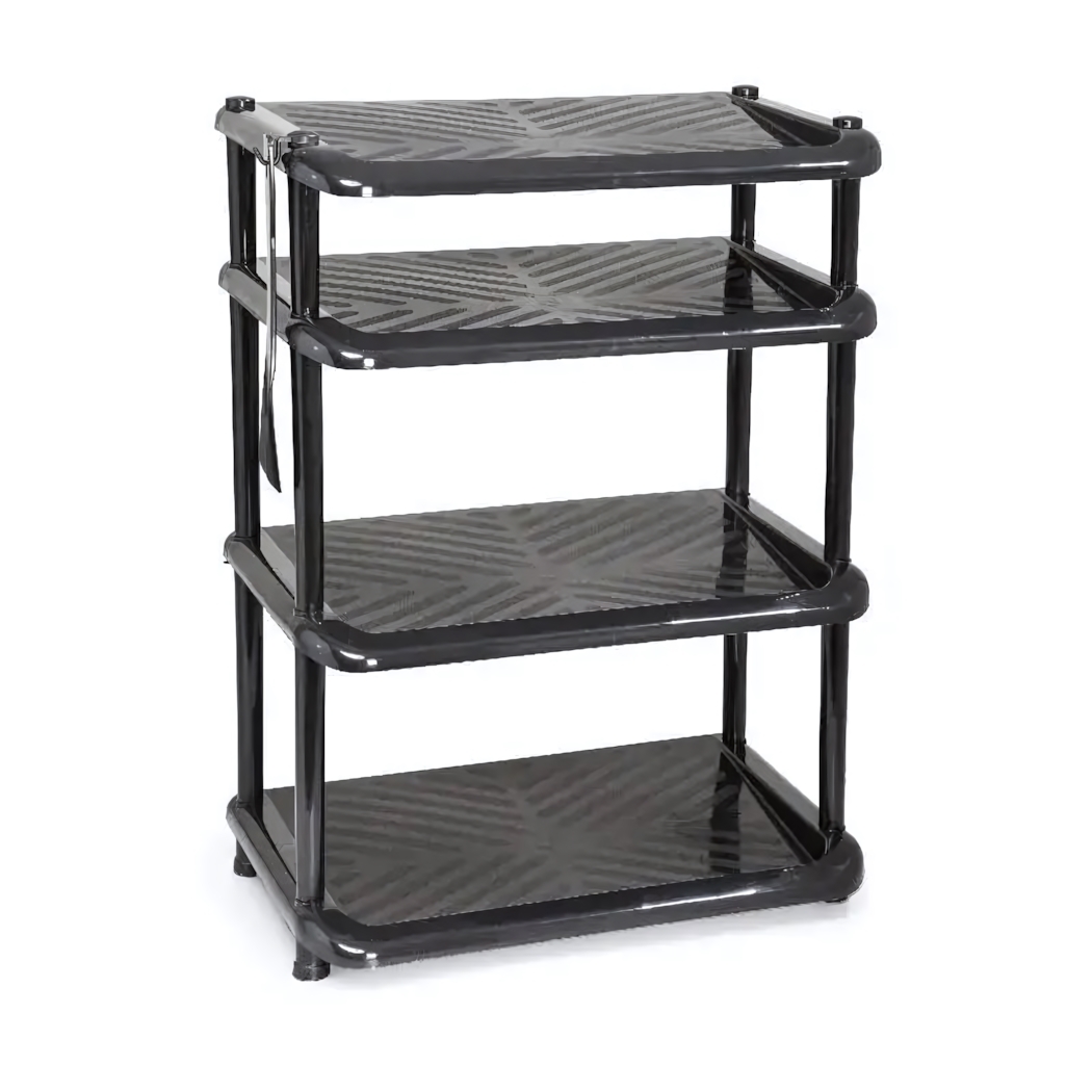Практичная 4-ярусная этажерка из прочного пластика — идеальное решение для компактного хранения обуви в прихожей, гардеробной или на балконе. Решетчатая конструкция обеспечивает циркуляцию воздуха, а рифленая поверхность полок предотвращает скольжение обуви.
