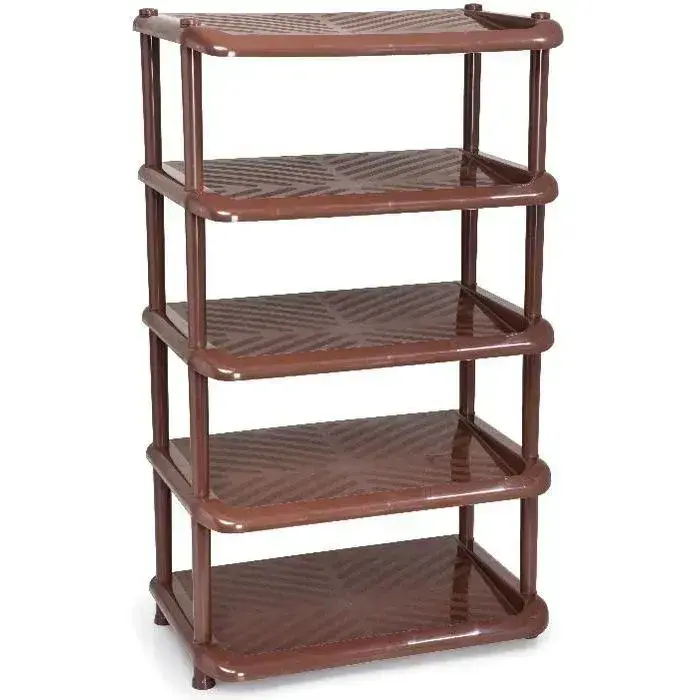 Многоярусная система из высокопрочного пластика устойчива к влаге и перепадам температур. Горизонтальные рифленые полки с диагональным узором обеспечивают вентиляцию и быструю просушку обуви. Вертикальные стойки с усиленными соединениями гарантируют долговечность даже при активной эксплуатации.