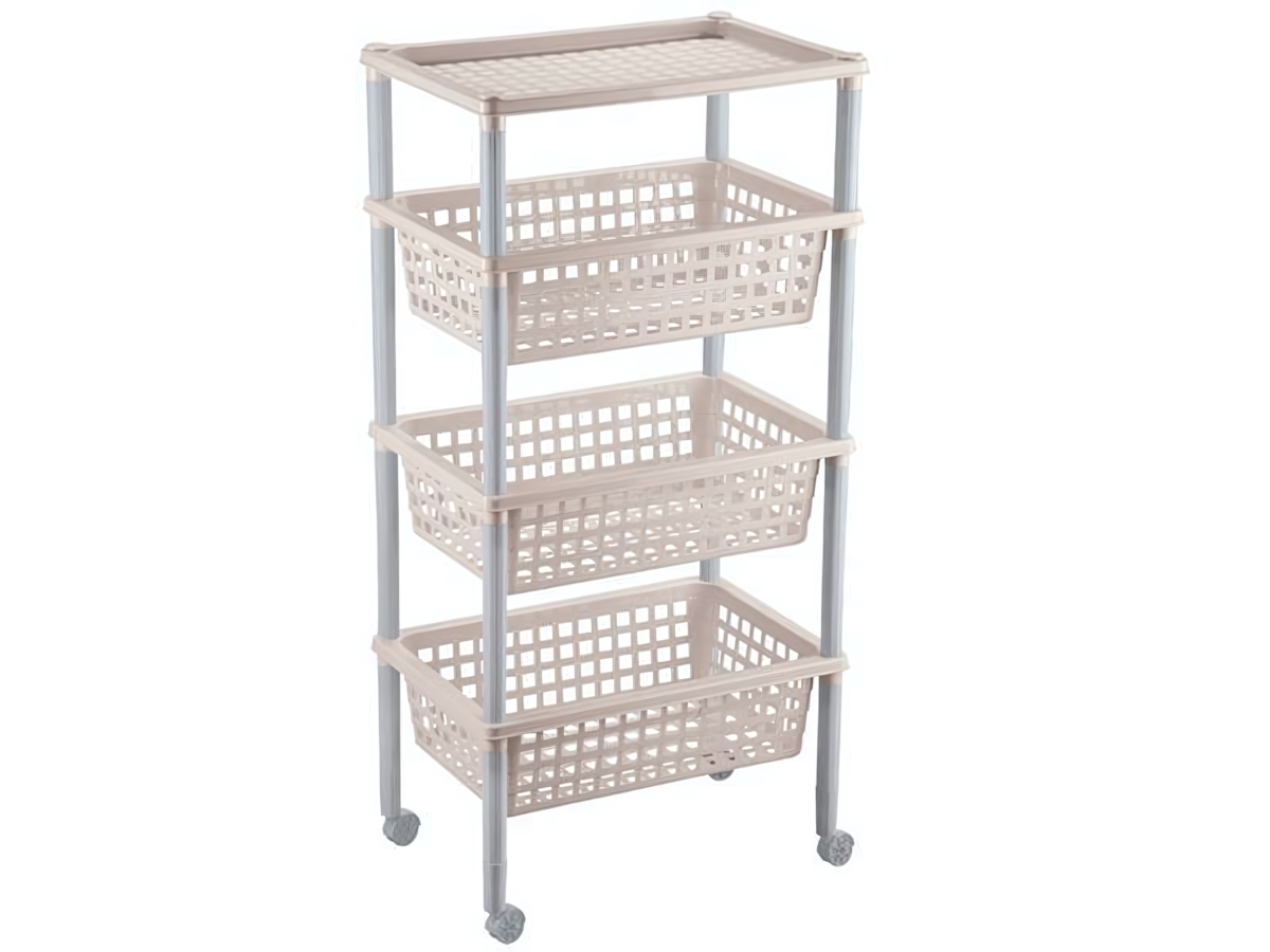 Этажерка состоит из трех корзин и одной полки, что позволяет удобно размещать различные продукты. Она идеально подходит для хранения овощей, фруктов, а также может использоваться для хранения кухонных принадлежностей или даже игрушек. Благодаря колесам, этажерку легко перемещать по кухне или прихожей, что делает ее еще более практичной.