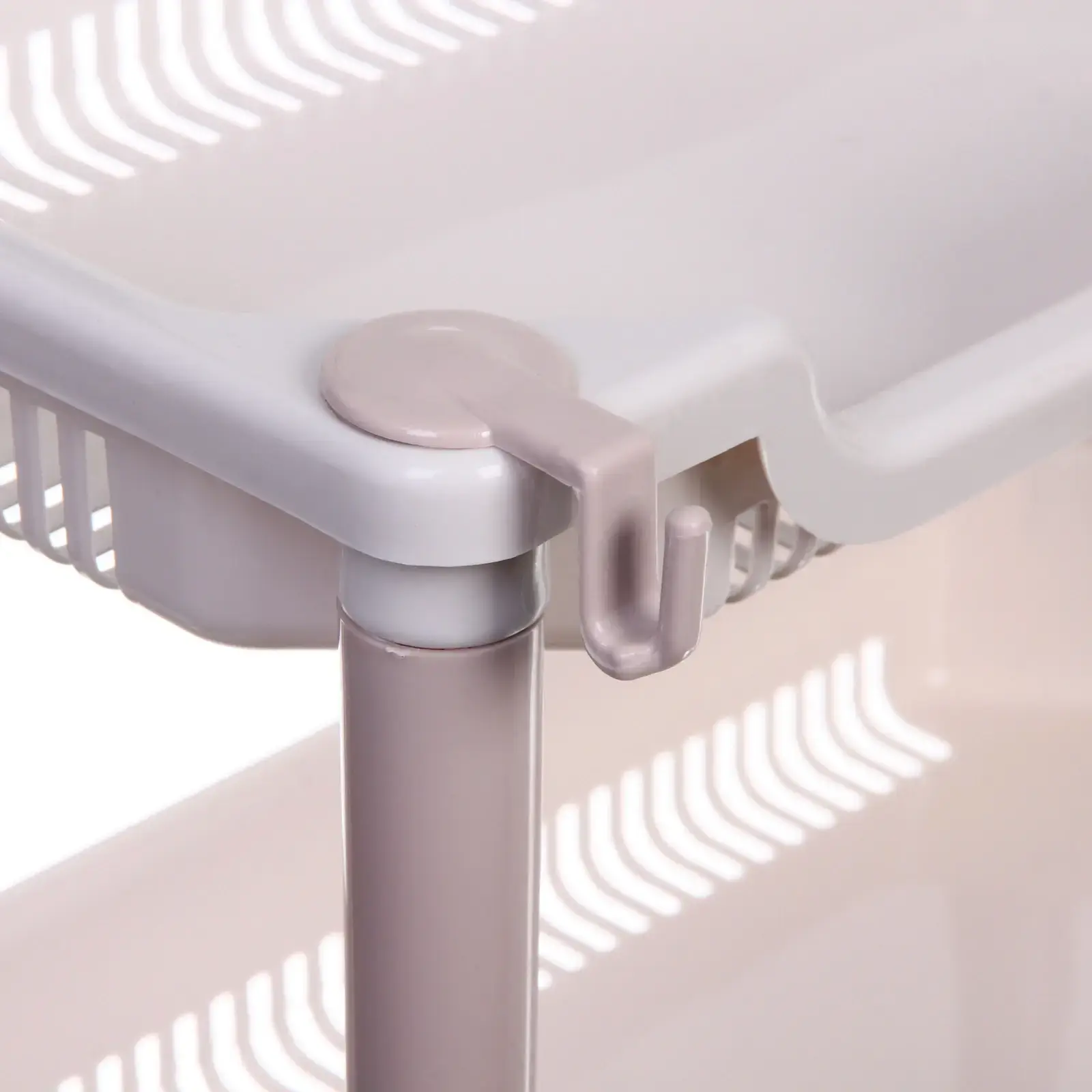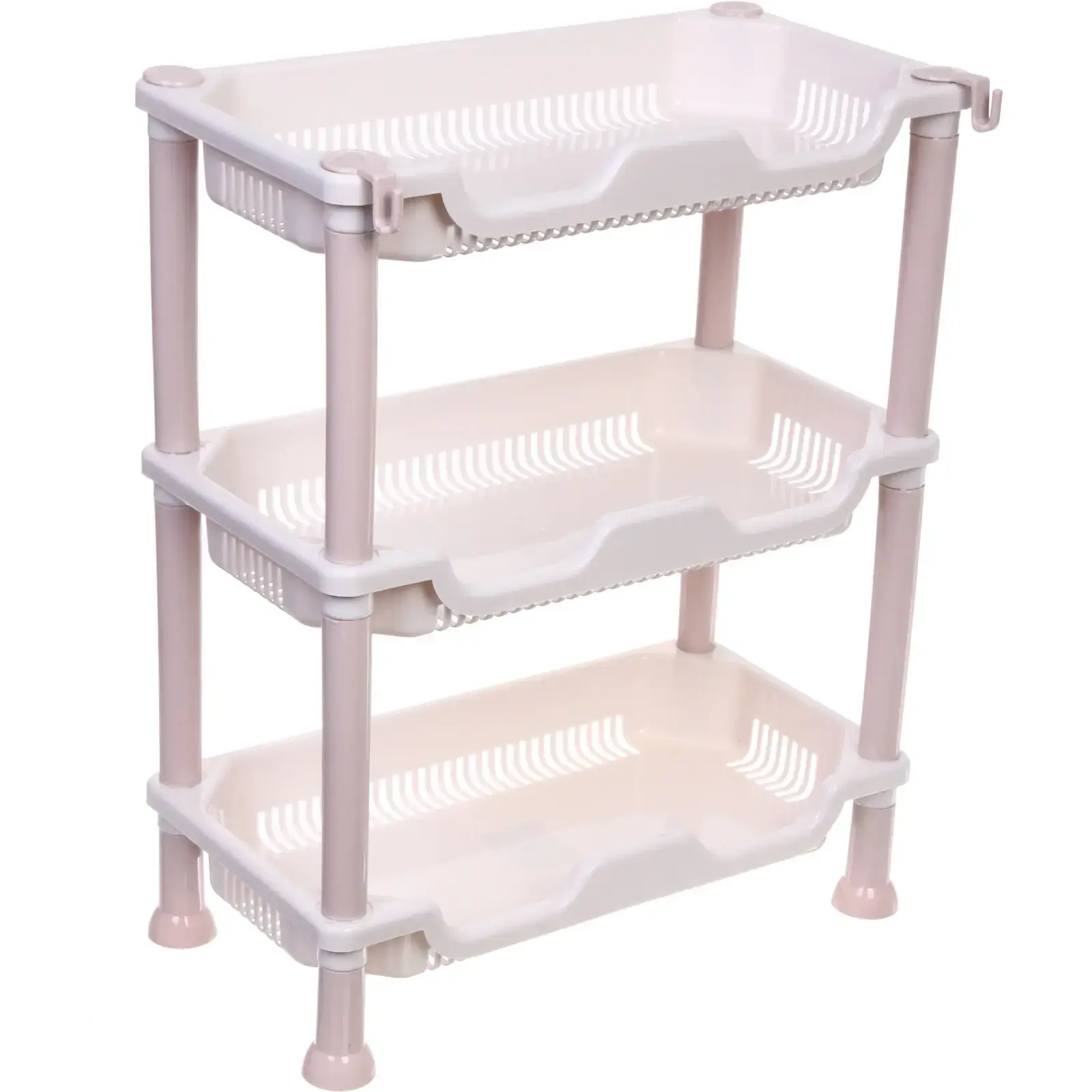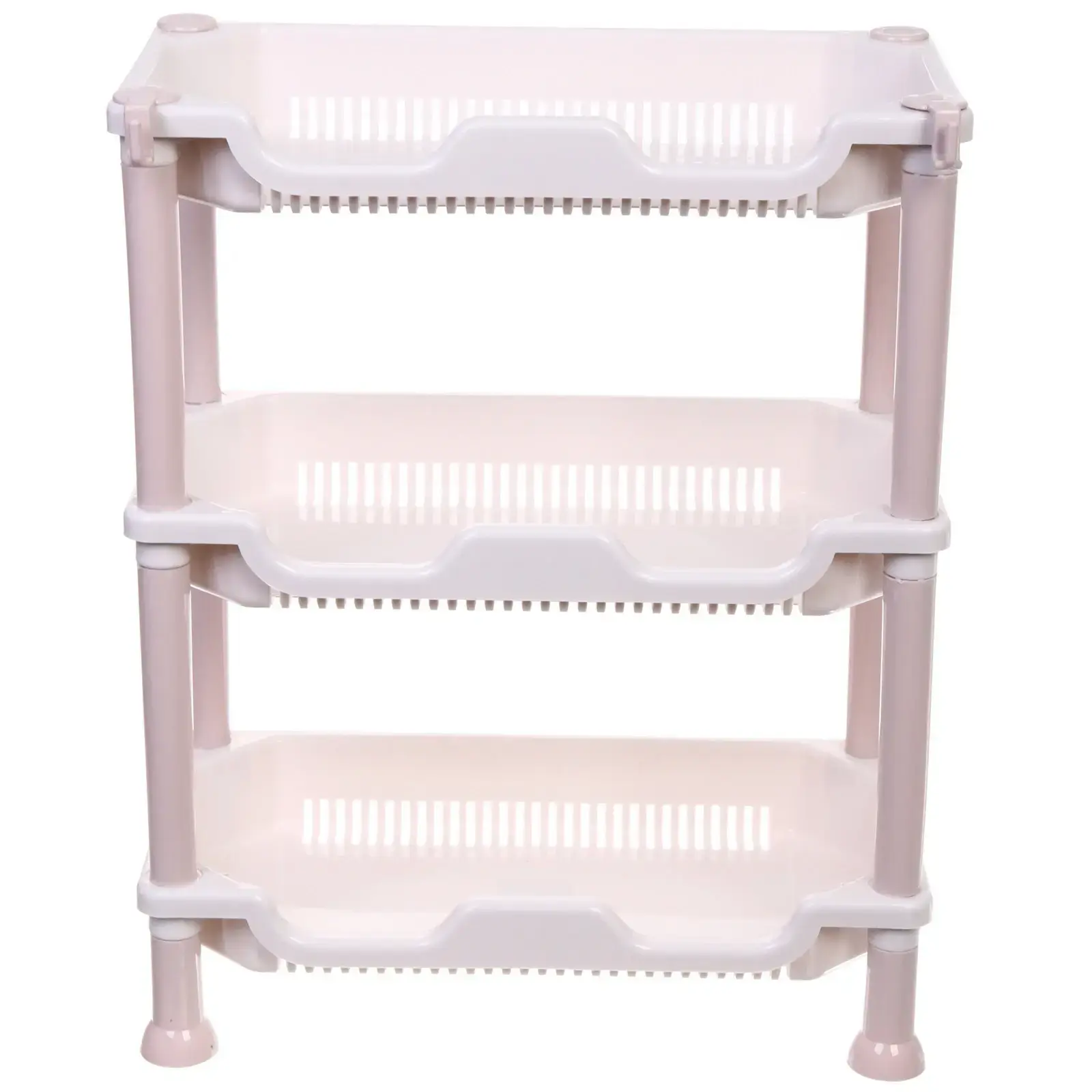 Этажерка выполнена из прочного пластика, что обеспечивает её долговечность и легкость в уходе. Она поставляется в собранном виде, что позволяет сразу же использовать её без необходимости сборки. Три открытых полки с бортиками предотвращают вываливание предметов, а решетчатая структура обеспечивает хорошую вентиляцию, что особенно важно для хранения продуктов.