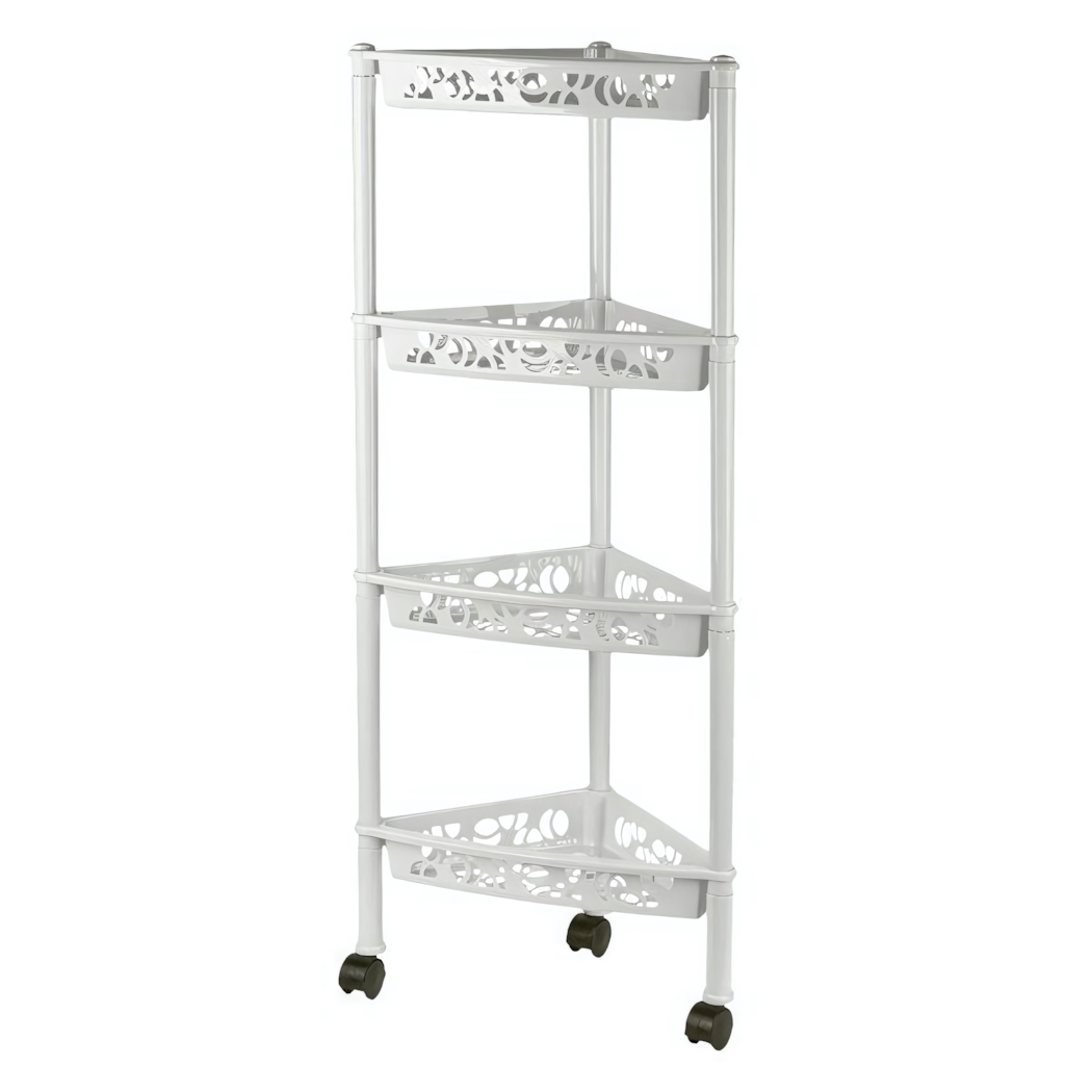 Этажерка состоит из четырех полок, которые обеспечивают достаточное пространство для хранения различных предметов. Полки имеют небольшие бортики, что предотвращает падение вещей. Удобные колесики на нижних ножках позволяют легко перемещать этажерку по комнате, что делает ее идеальной для тех, кто ценит мобильность и практичность.
