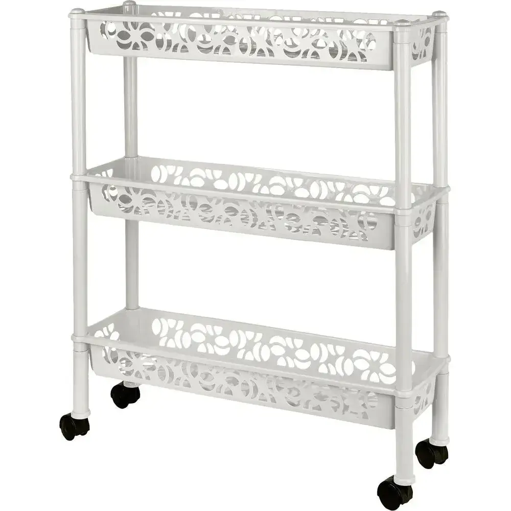 Трехъярусная система хранения с габаритами 58×69 см оптимальна для небольших помещений. Комбинированная конструкция из пластика и металла обеспечивает устойчивость и долговечность. Белый цвет гармонично вписывается в любой интерьер.