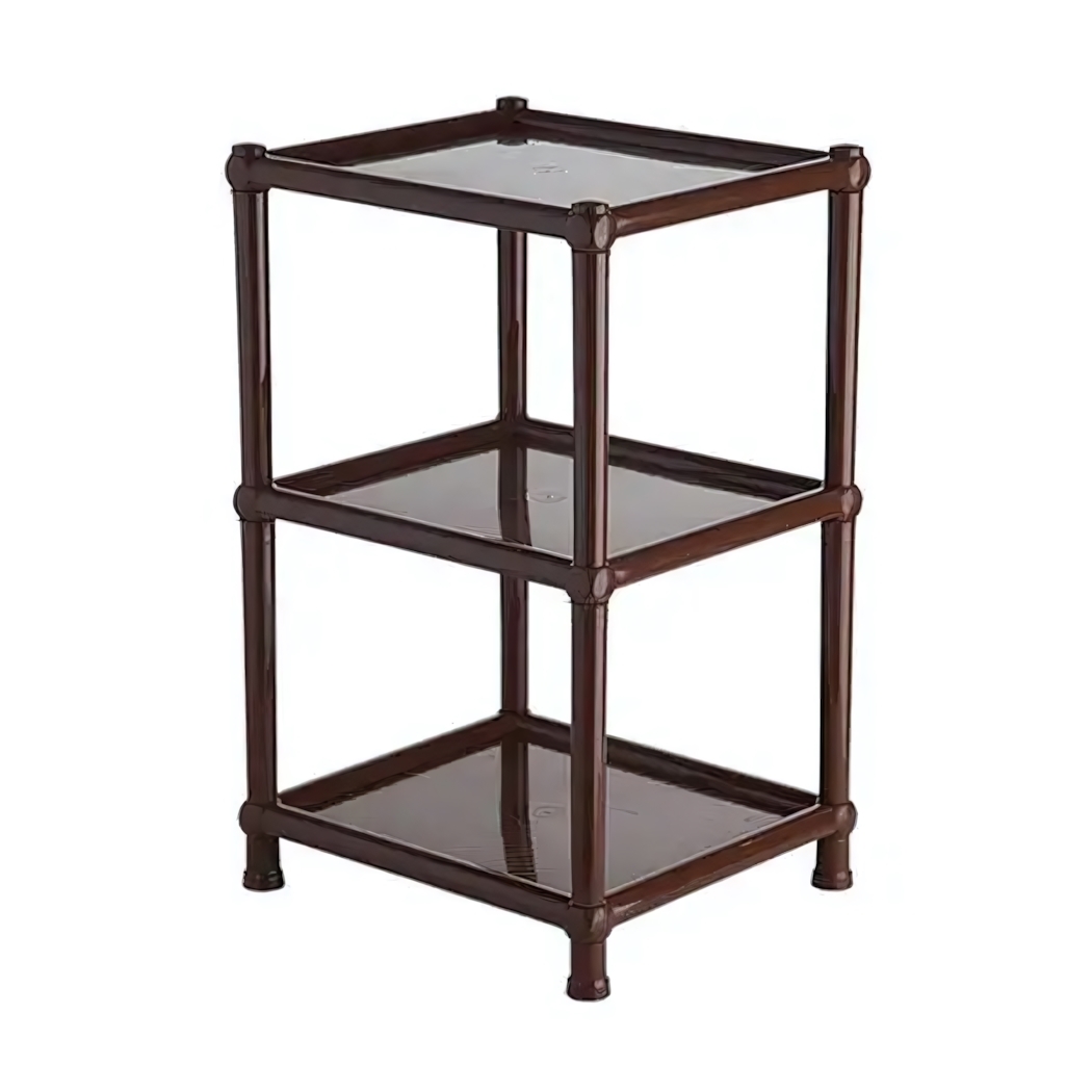 Компактная квадратная конструкция с тремя полками идеально впишется в любое пространство. Прочный пластик выдерживает нагрузку до 15 кг на ярус, сохраняя устойчивость и аккуратный внешний вид.