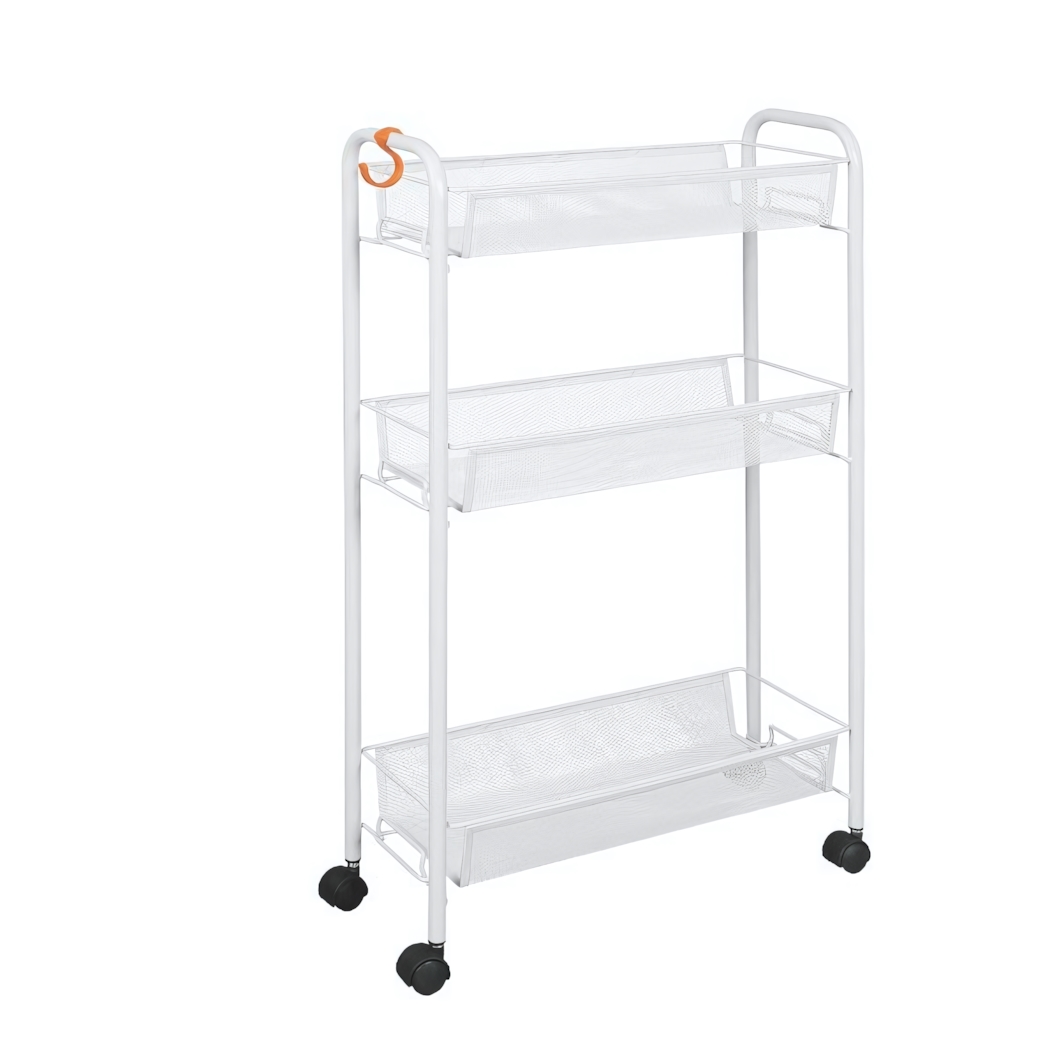 Три вместительные корзины позволяют удобно рассортировать продукты, посуду, бытовую химию или аксессуары для ванной комнаты. Увеличенное расстояние между нижними корзинами подходит для хранения более высоких предметов. Этажерка легко перемещается благодаря поворотным пластиковым колесам, а закругленные верхние элементы можно использовать как ручки.
