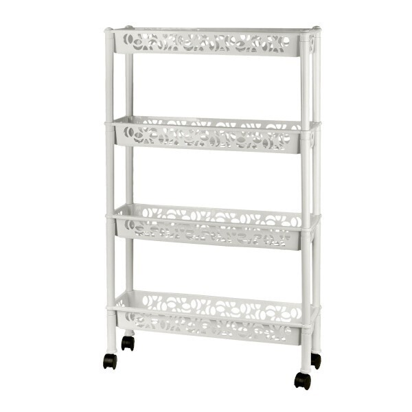 Этажерка состоит из четырех полок с небольшими бортиками, что обеспечивает надежное хранение ваших вещей. Она легко собирается без использования инструментов — достаточно соединить стойки и полки, вставить ножки и заглушки. На нижних ножках предусмотрены колесики, что позволяет легко выдвигать и устанавливать этажерку на место, обеспечивая максимальное удобство в использовании.