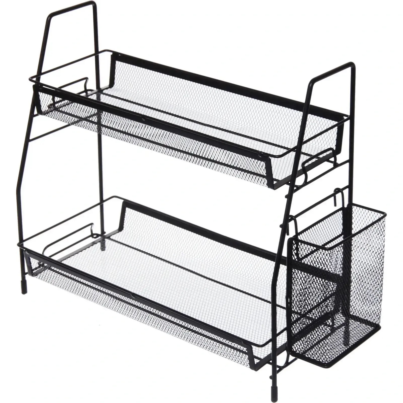 Металлическая этажерка с двумя ярусами и боковым карманом поможет содержать косметику, средства для ухода и аксессуары в идеальном порядке. Черный цвет и лаконичный дизайн гармонично впишутся в интерьер ванной комнаты, спальни или туалетного столика.