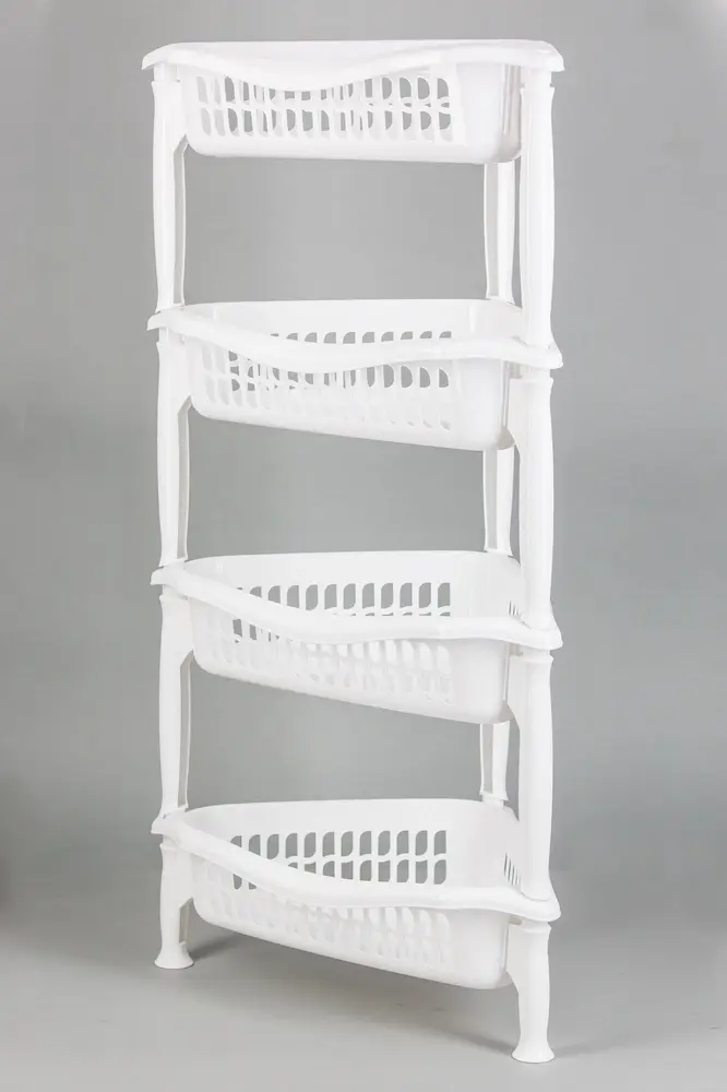 Изготовленная из прочного пластика, этажерка устойчива к влаге и перепадам температур, что делает её идеальной для ванной комнаты или кухни. Ребристая поверхность полок обеспечивает вентиляцию содержимого, предотвращая образование плесени. Конструкция легко собирается без дополнительных инструментов.