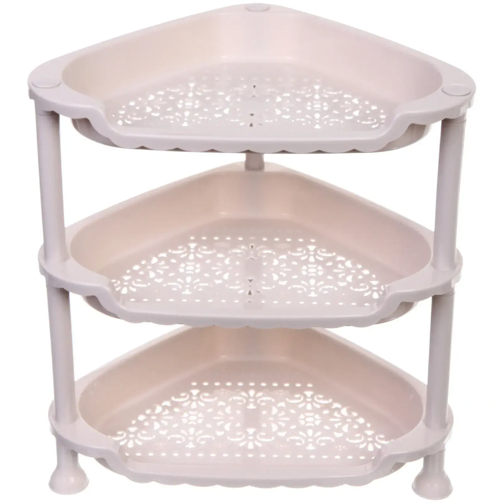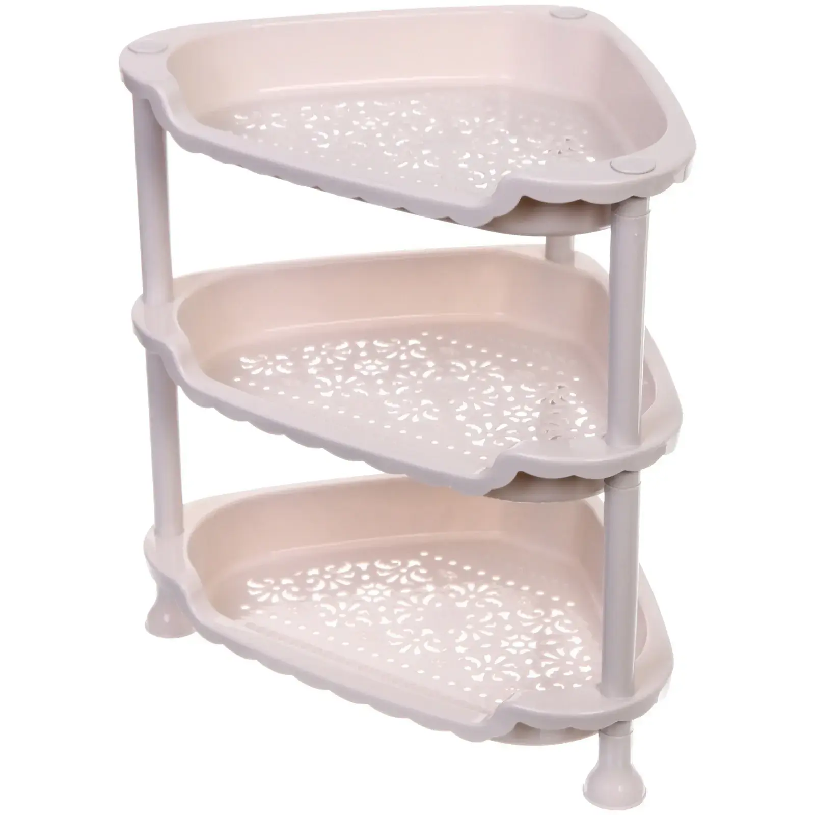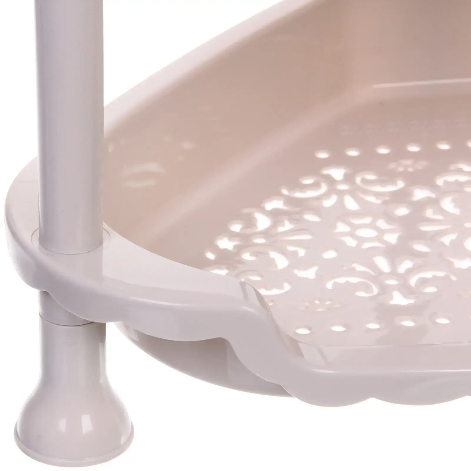 Основное преимущество этой этажерки — это её практичность и удобство. Перфорированные полки обеспечивают хорошую вентиляцию, что особенно важно для хранения ванных принадлежностей или кухонных аксессуаров. Закругленные края добавляют безопасности, а устойчивые пластиковые ножки гарантируют надежность конструкции. Этажерка легка в уходе и не требует сложного монтажа, что делает её идеальным выбором для любого дома.