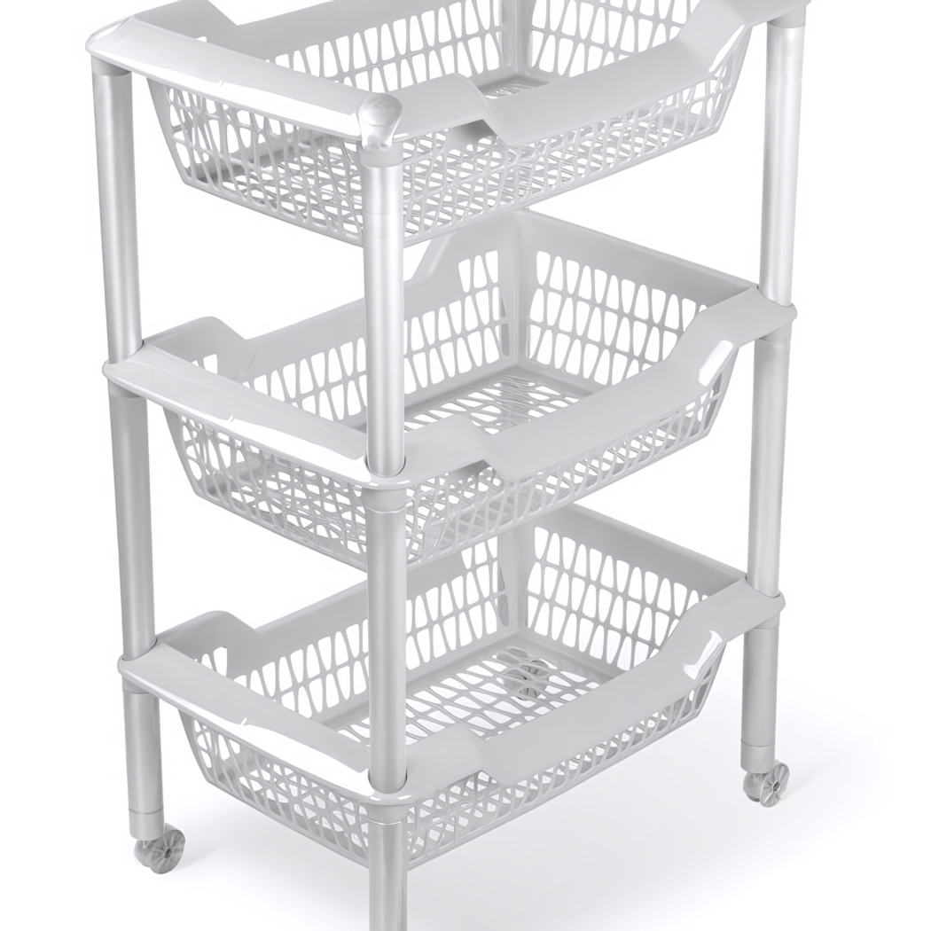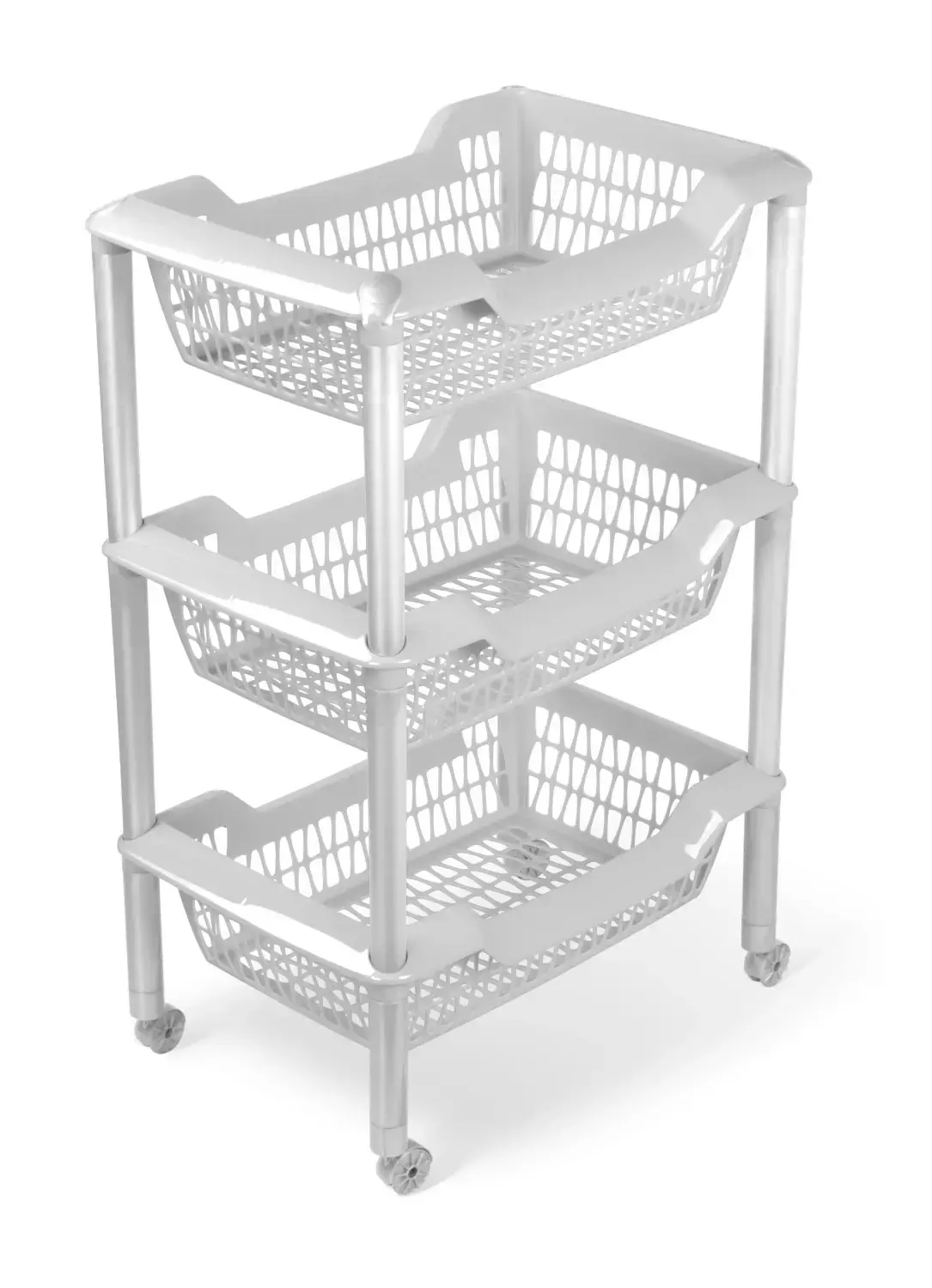 Этажерка состоит из трёх пластиковых корзин с сетчатой структурой, что обеспечивает хорошую вентиляцию и видимость содержимого. Она подходит для использования в любых помещениях, включая кухни, ванные комнаты и детские. Удобные выемки на корзинах позволяют легко извлекать их при необходимости.