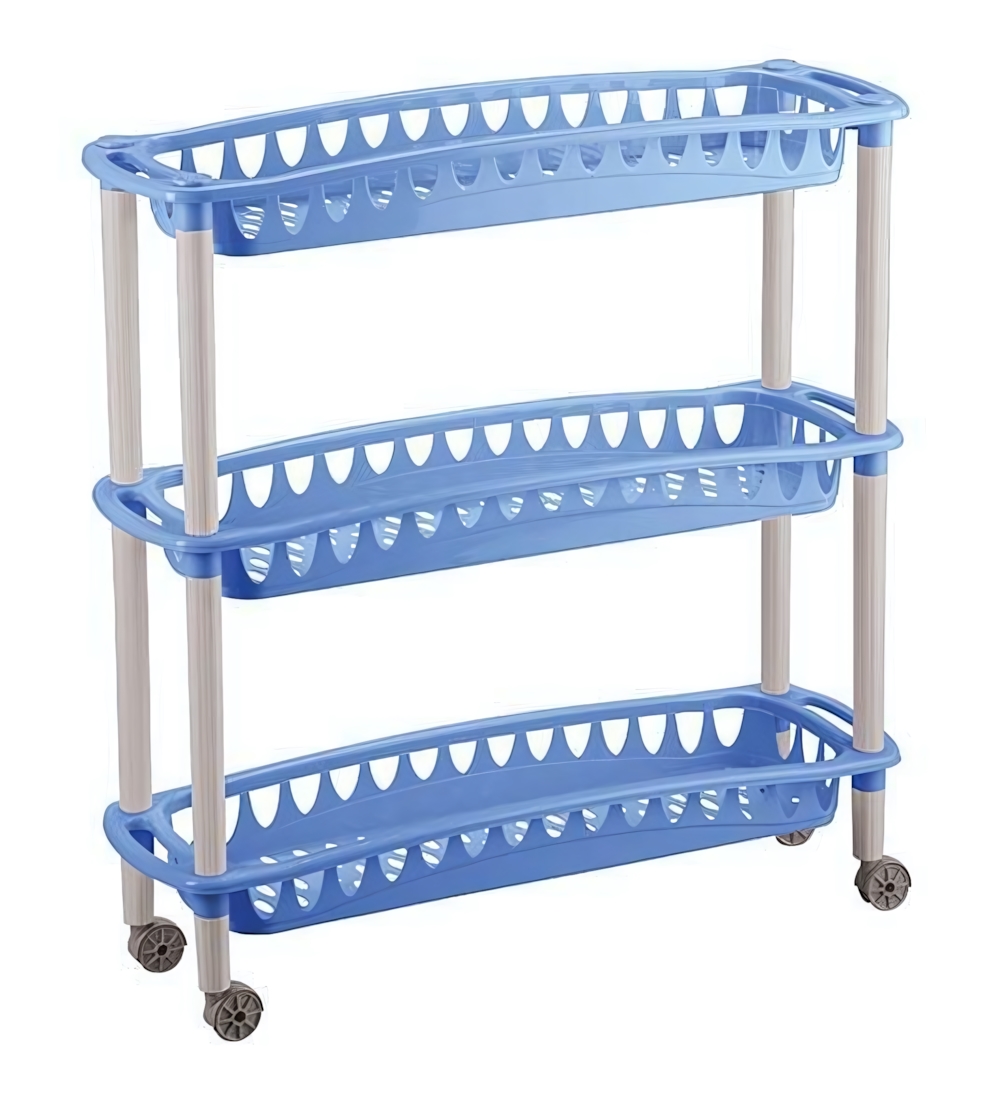 Этажерка выполнена в стильном светло-голубом цвете, который добавит яркости в ваш интерьер. Полки имеют овальную форму с отверстиями по краям для вентиляции, что предотвращает накопление пыли и обеспечивает легкий доступ к хранимым предметам. Металлические ножки придают конструкции устойчивость и надежность.