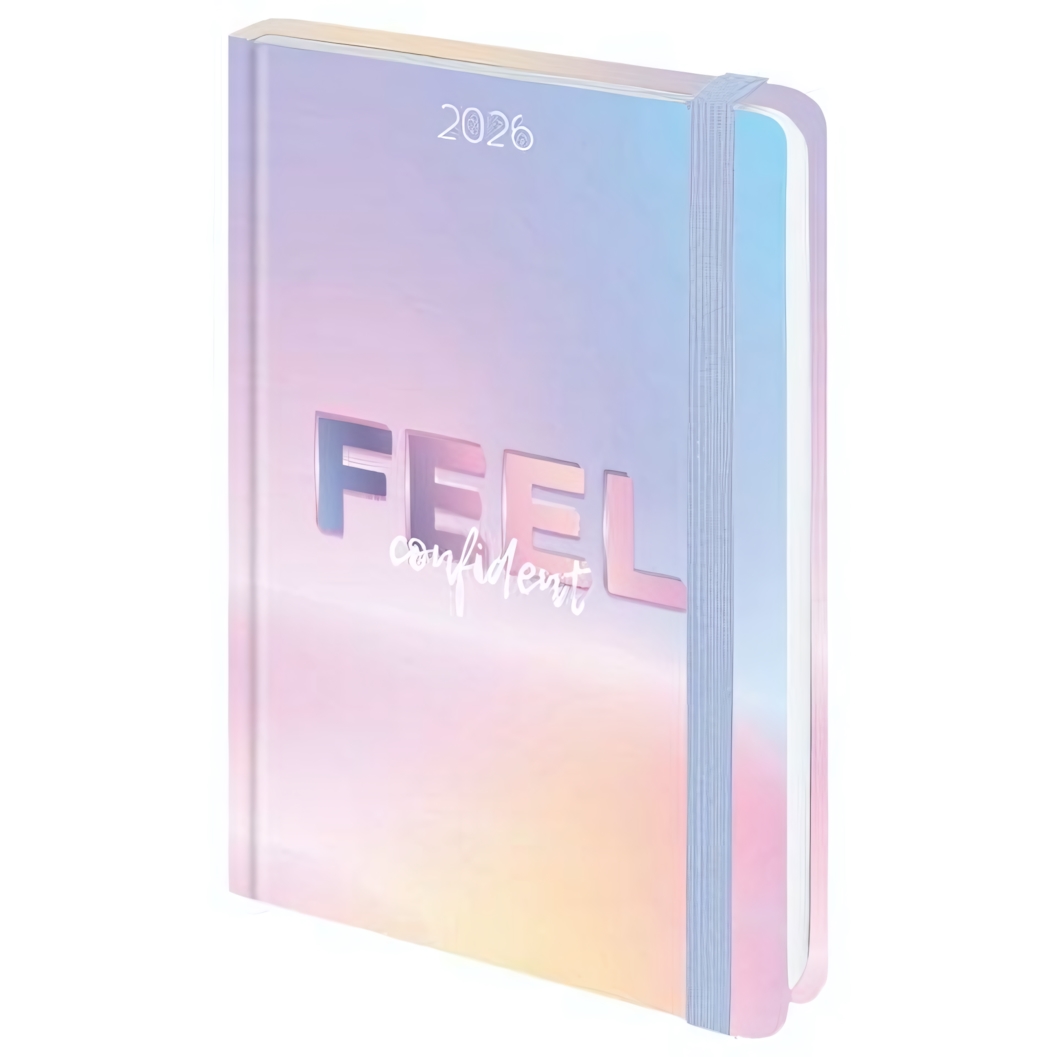Ежедневник 'Нежность' отличается элегантным дизайном с градиентной обложкой в пастельных цветах, переходящей от фиолетового к розовому и желтому, что добавляет оригинальности и стиля в ваш образ. Текст на обложке гласит: 'FEEL confident', напоминая о важности уверенности в себе в процессе планирования.