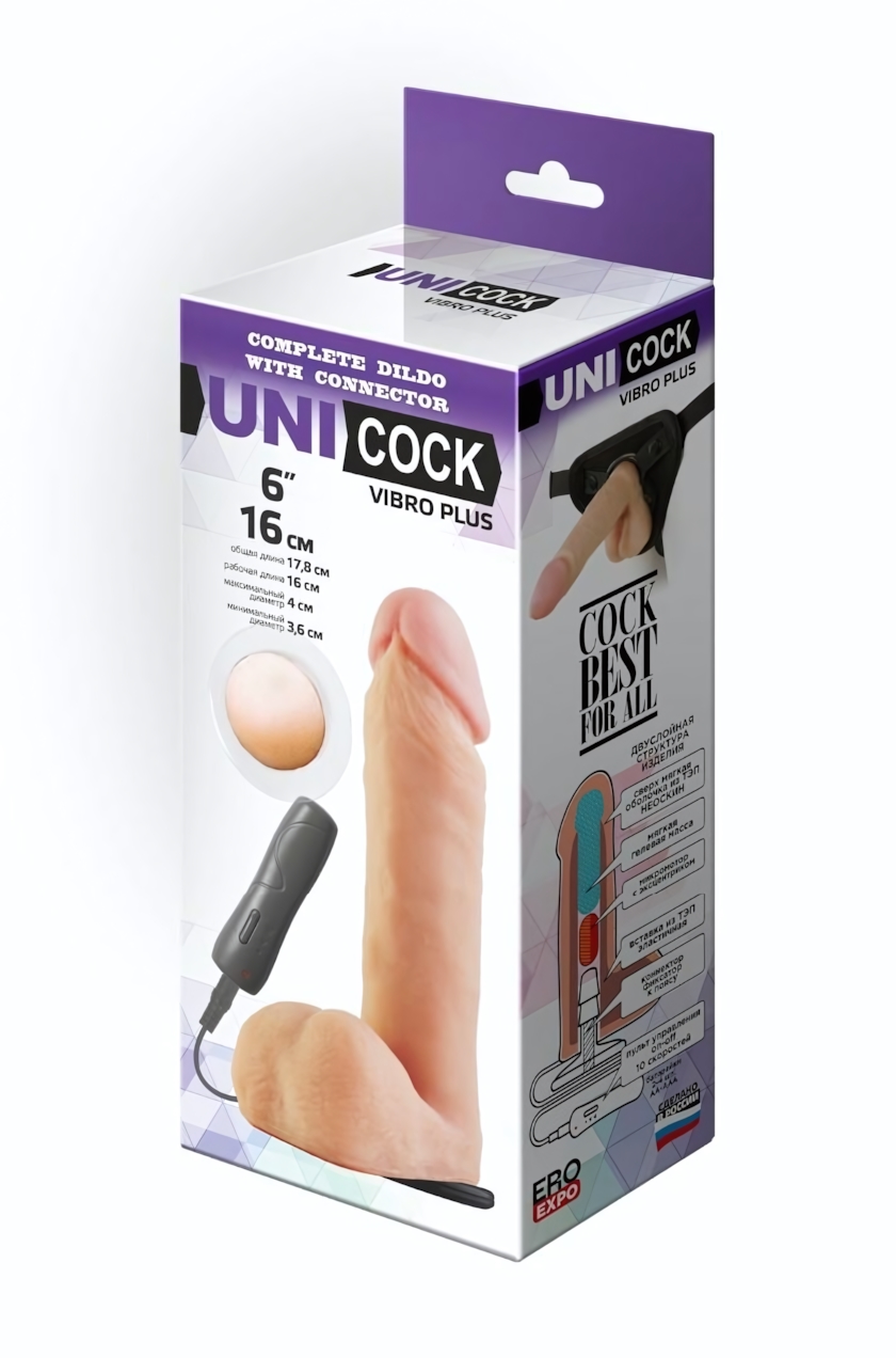 Насадка для страпона с вибрацией UNICOCK, 18 см, телесный цвет, материал неоскин, диаметр 4 см