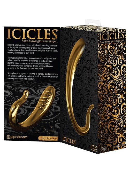 Стеклянный массажёр ICICLES Gold Edition сочетает эстетику ювелирного украшения с функциональностью премиального аксессуара. Изогнутая форма с рифлёной поверхностью создаёт интенсивные тактильные ощущения, а гипоаллергенное стекло гарантирует абсолютную безопасность.