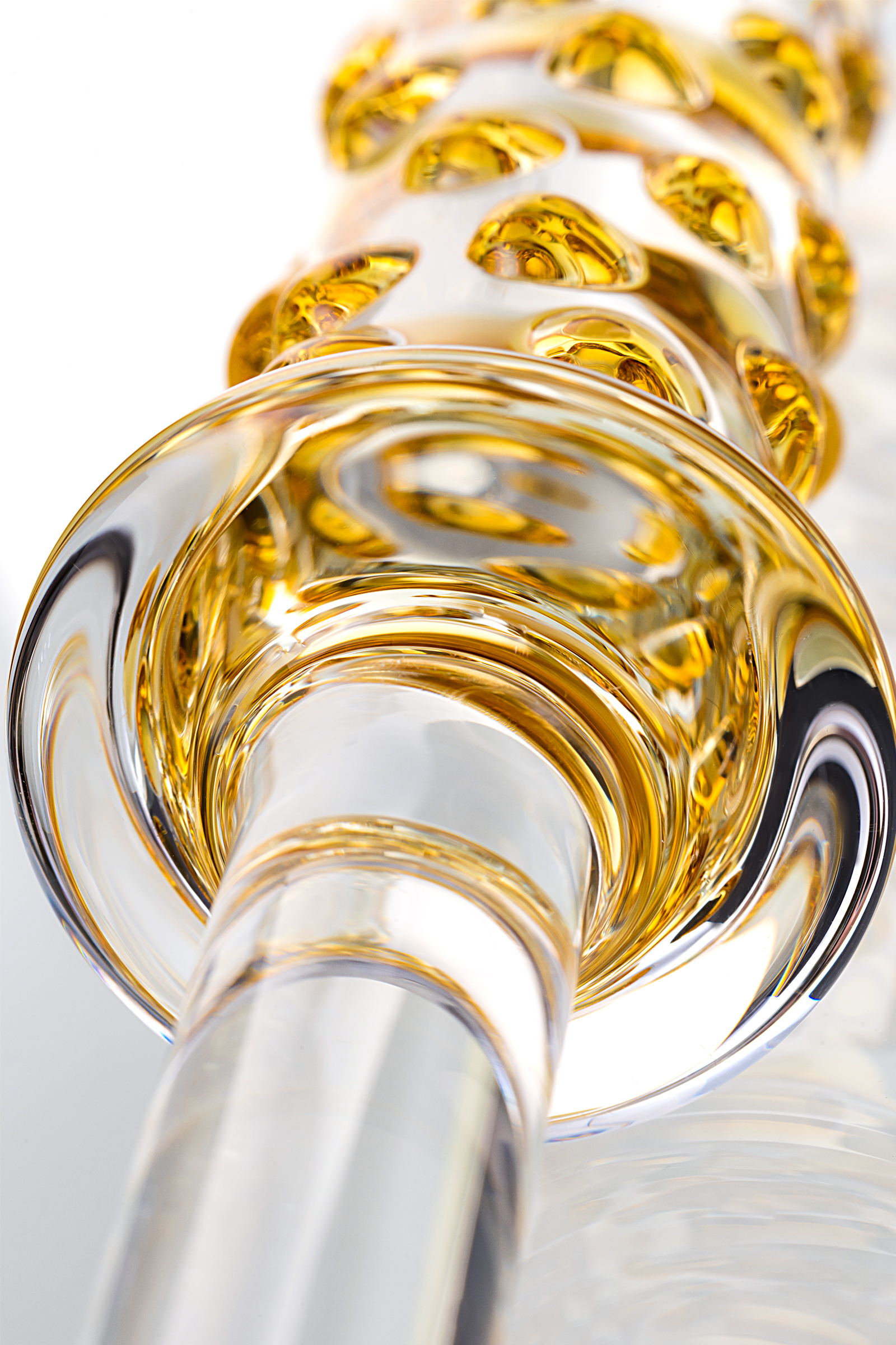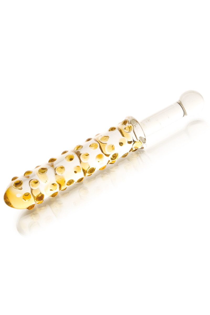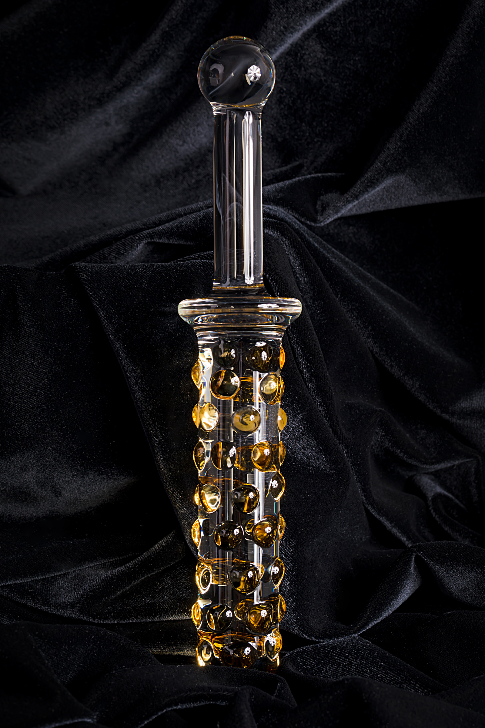 Длина изделия составляет 23,5 см, диаметр варьируется от 1,7 до 3,1 см, что позволяет постепенно увеличивать интенсивность ощущений. Прозрачное стекло с декоративными желтыми элементами выглядит эстетично и подчеркивает необычную форму стимулятора. В комплект входит 1 изделие в индивидуальной упаковке.