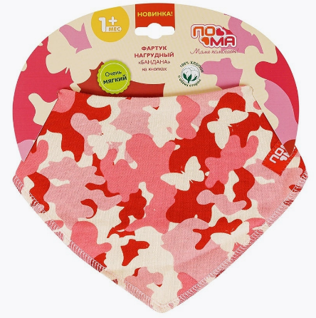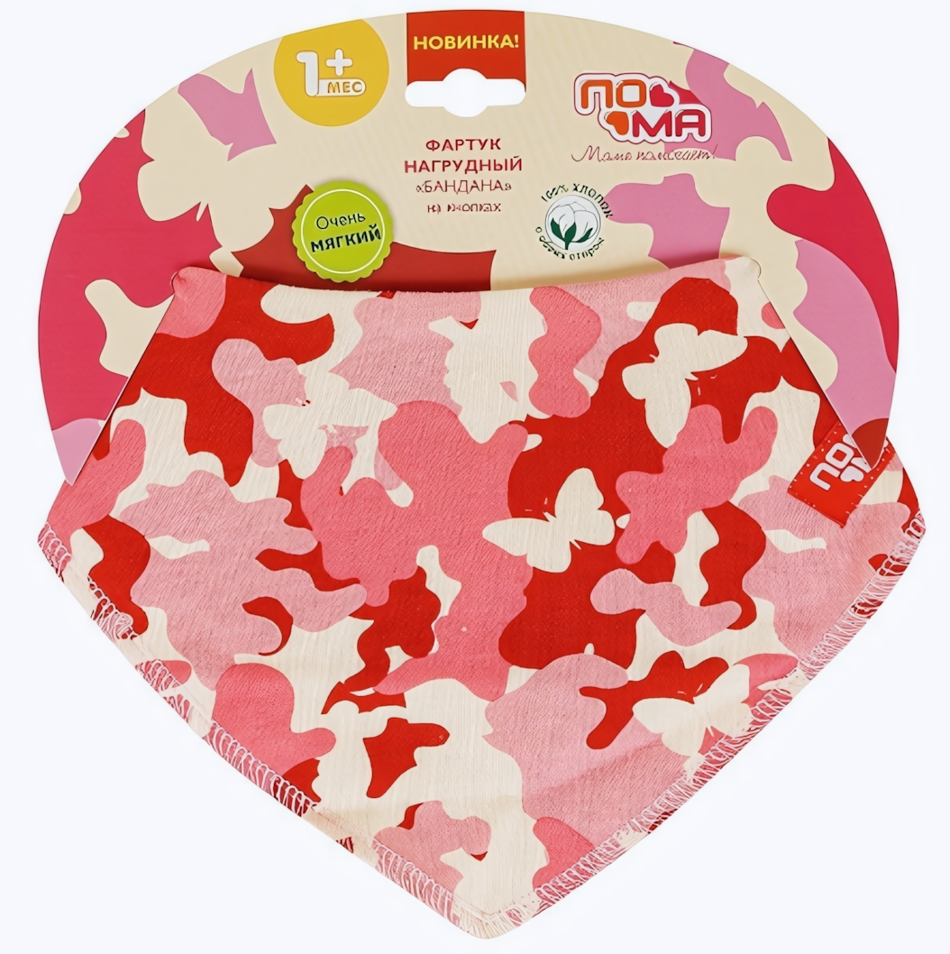 Фартук имеет стильный дизайн в розово-красных тонах с камуфляжным принтом. Размер подходит для детей от 1 месяца. Стирка возможна при температуре до 40°C без потери качества ткани.
