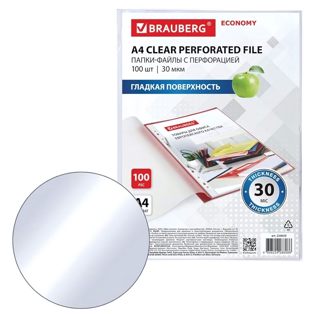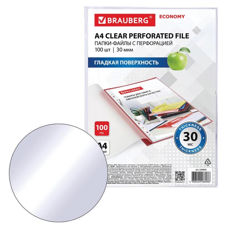 Файлы перфорированные А4, набор 100шт, гладкие, 30мкм "ECONOMY" (BRAUBERG)