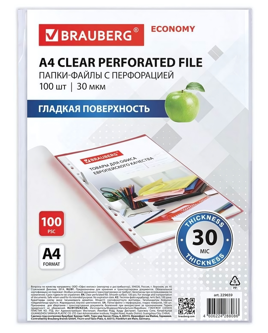 В набор входит 100 файлов стандартного размера А4 (210х297 мм). Прозрачная пленка позволяет быстро находить нужные документы, а плотность 30 мкм обеспечивает защиту от повреждений.