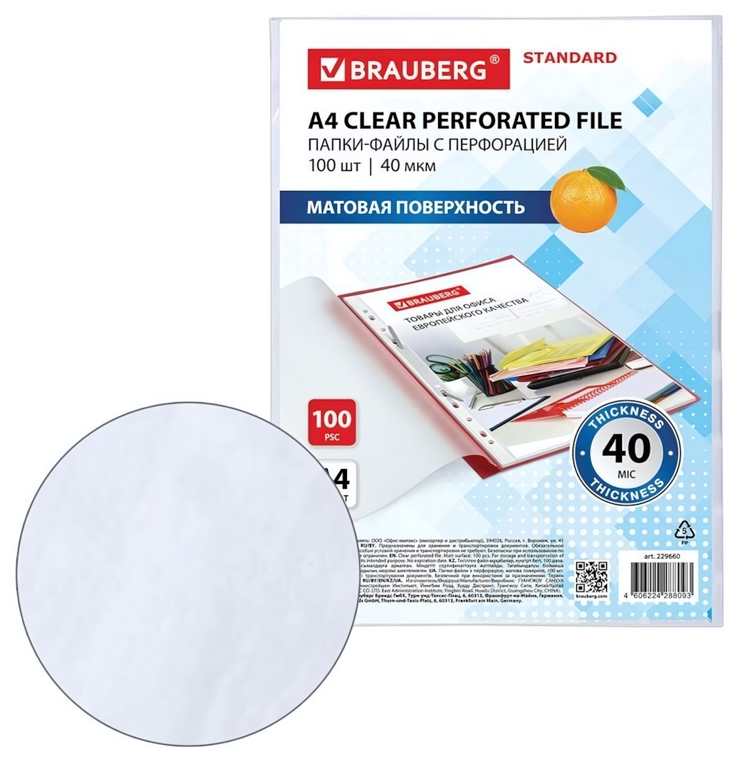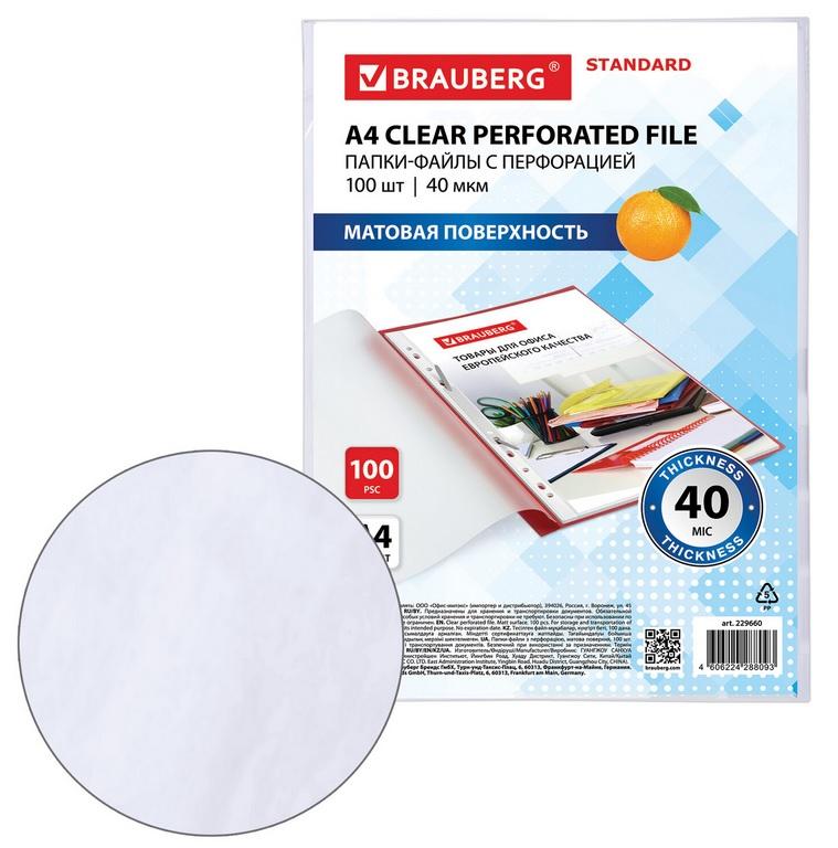 Файлы перфорированные "STANDARD" А4, матовые, 40мкм, 100шт/уп для документов BRAUBERG