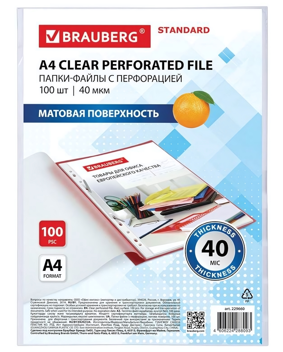 Перфорированные файлы BRAUBERG "STANDARD" — идеальное решение для организации рабочего пространства. Матовая поверхность предотвращает блики и сохраняет читаемость документов, а усиленные швы гарантируют многолетнюю эксплуатацию.
