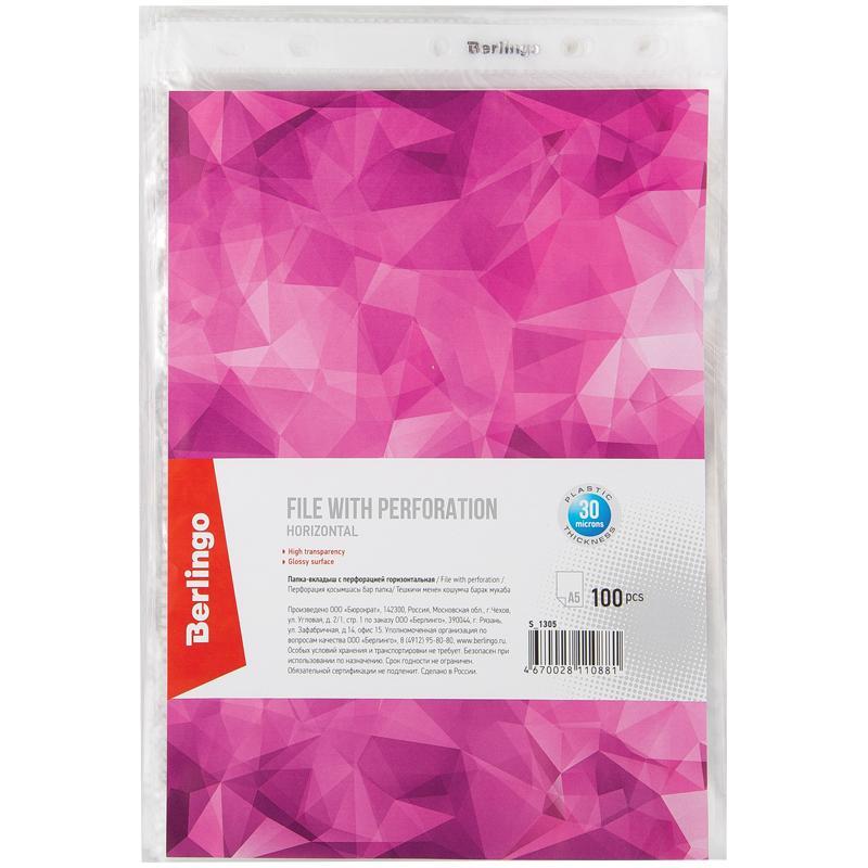 Файлы-вкладыши А5 с горизонтальной перфорацией, 100шт, глянцевые, 30мкм «Berlingo»