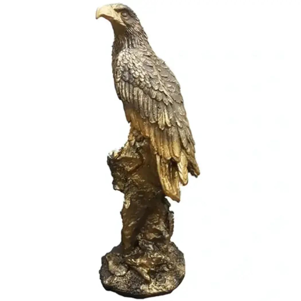 Каждая деталь проработана с особым вниманием: реалистичные перья, изогнутый клюв, мощные лапы, прочно закрепленные на скалистом основании. Эффект патинирования придает фигуре винтажный характер, создавая впечатление работы мастера с многолетней историей.