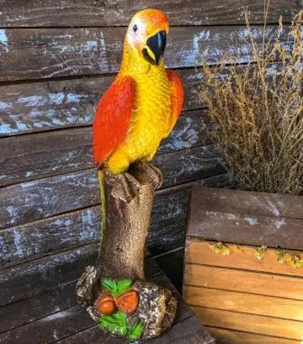 Яркая фигурка 'Попугай', высотой 55 см, станет изюминкой вашего сада или дачного участка. Гипсовая основа обеспечивает прочность и долговечность изделия при любых погодных условиях.