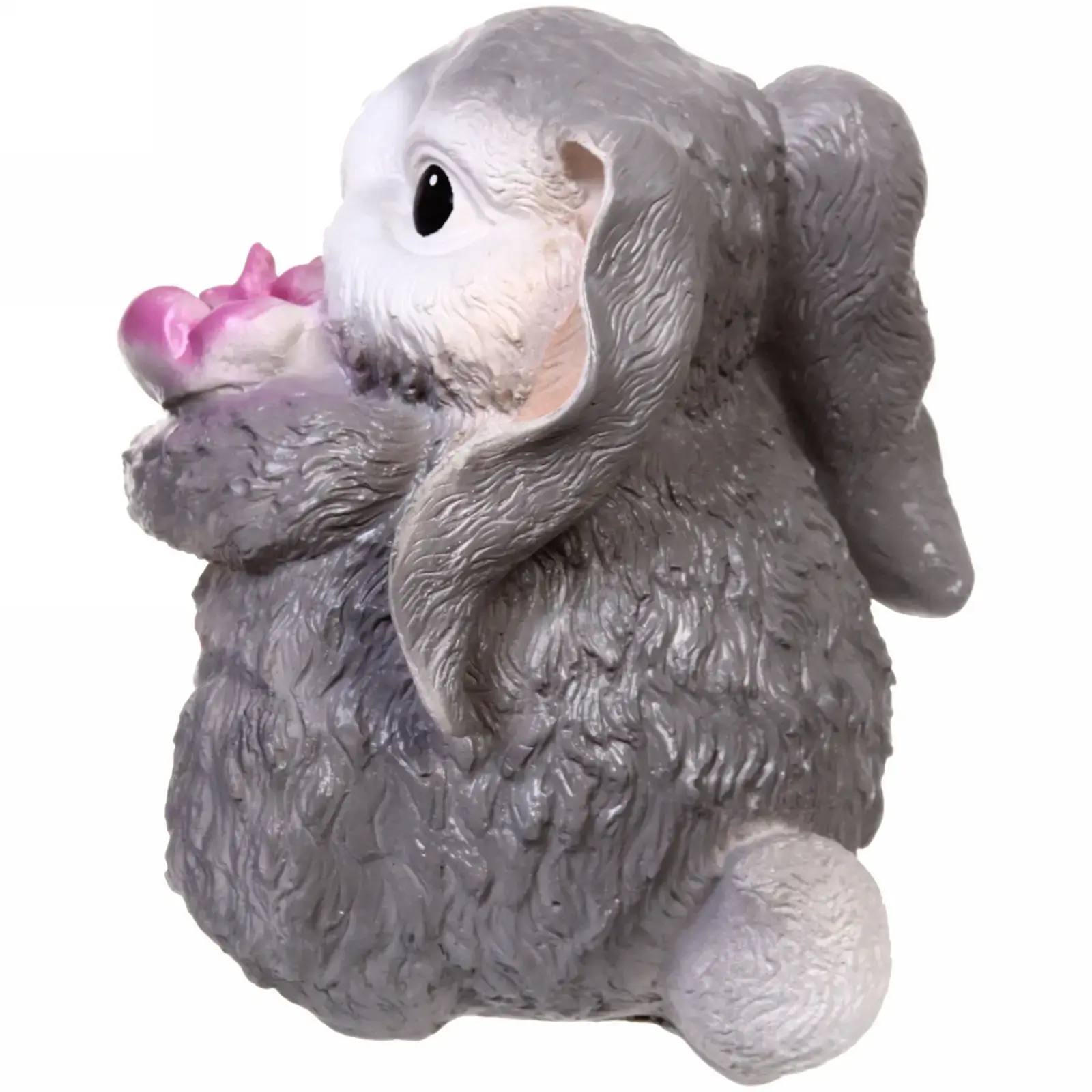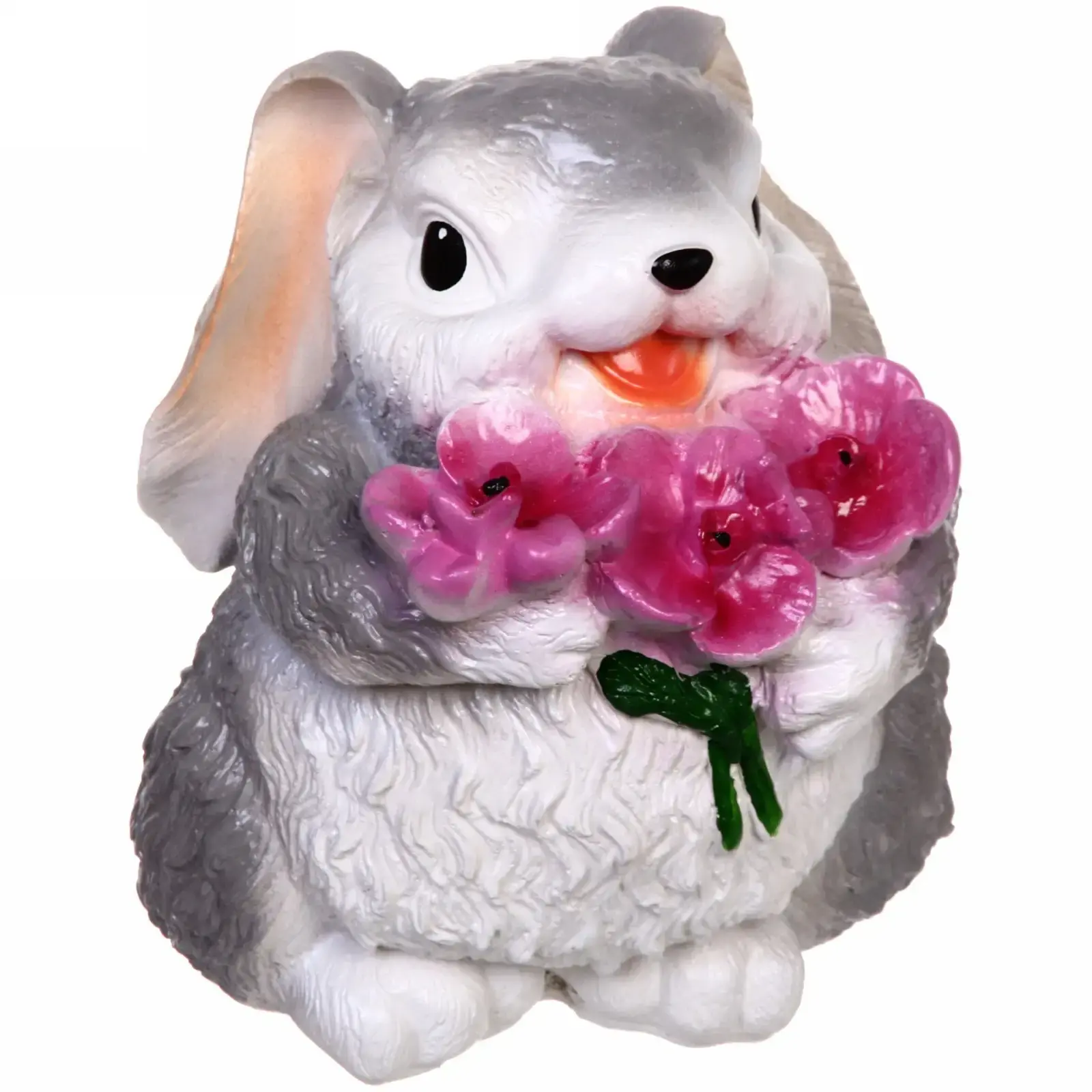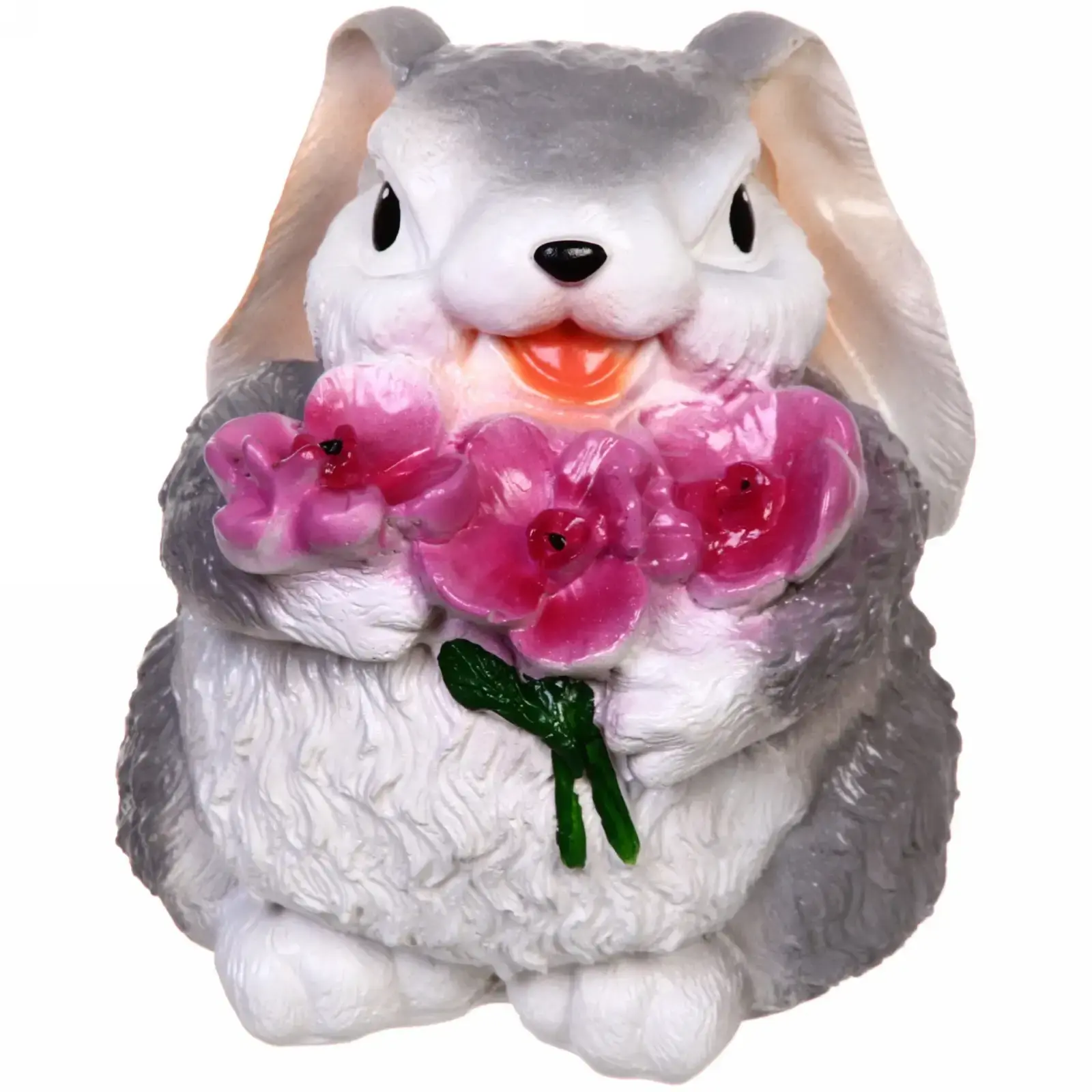 Фигура имеет серый окрас с белыми элементами, что придаёт ей естественный вид. Цветы, которые держит зайчик, выполнены в розовом цвете, добавляя яркости и свежести. Размер 24 см делает её компактной и удобной для размещения в различных уголках вашего сада или дома.
