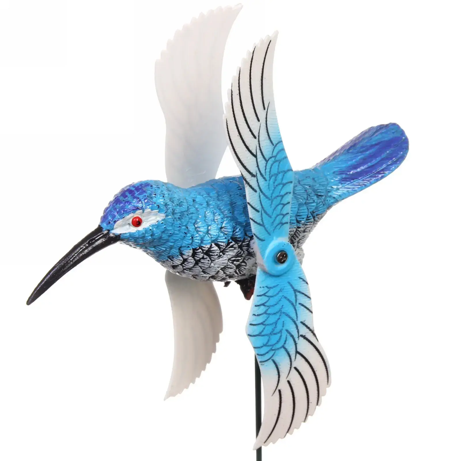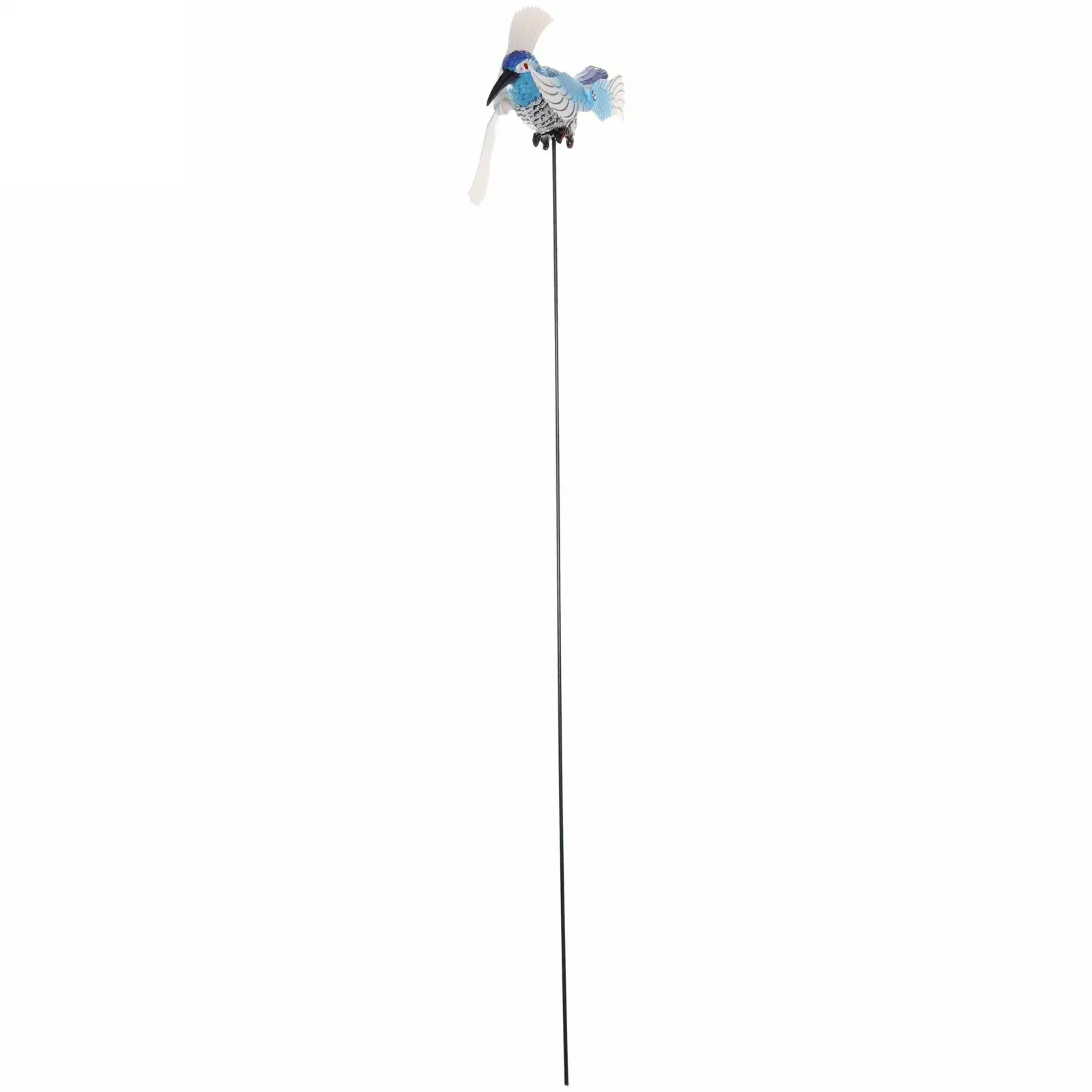 Общая высота конструкции — 40 см (14 см размер самой птицы). Сочетание пластикового корпуса с металлической основой обеспечивает долговечность даже при активной эксплуатации. Сине-белая цветовая гамма гармонирует с зеленью сада и цветочными композициями.