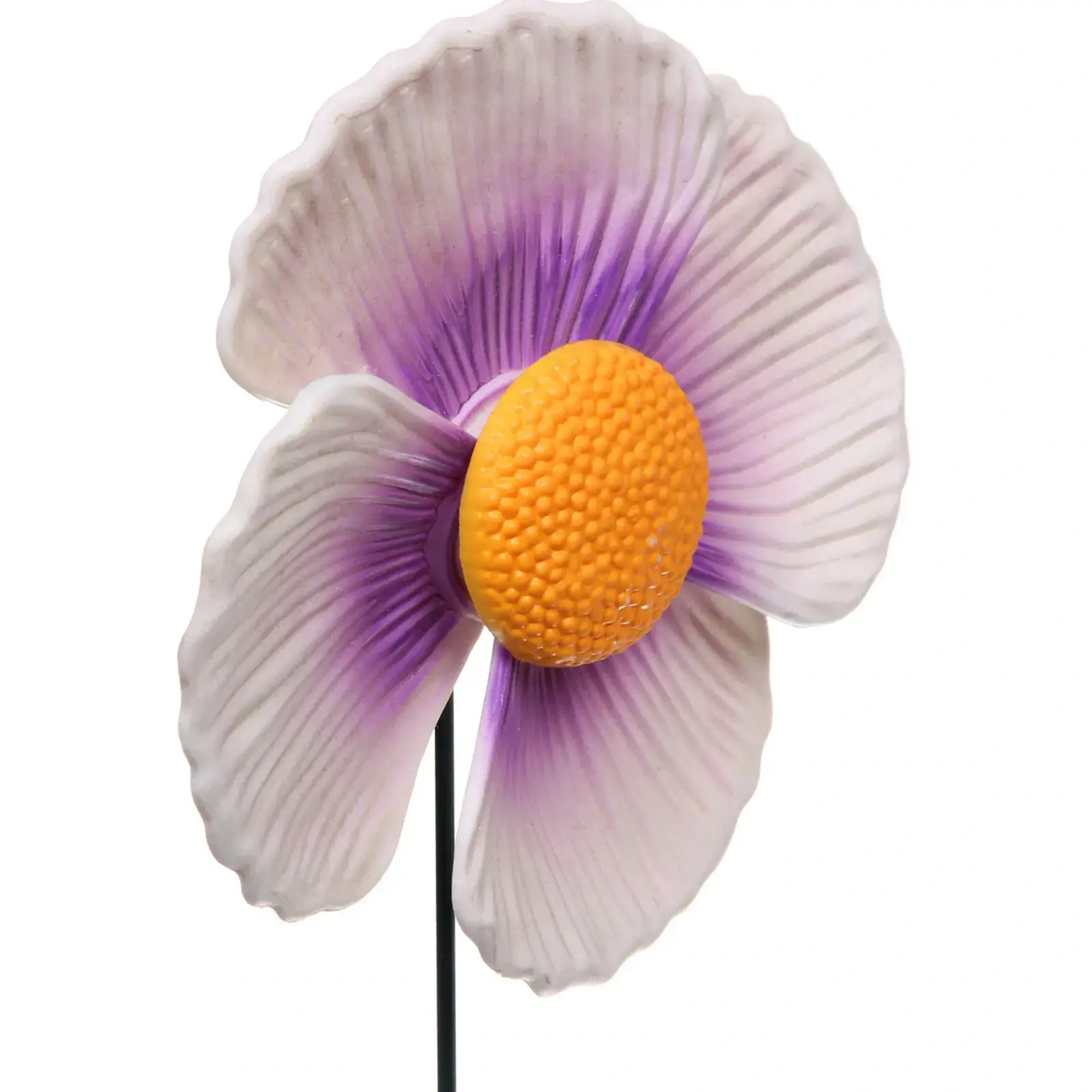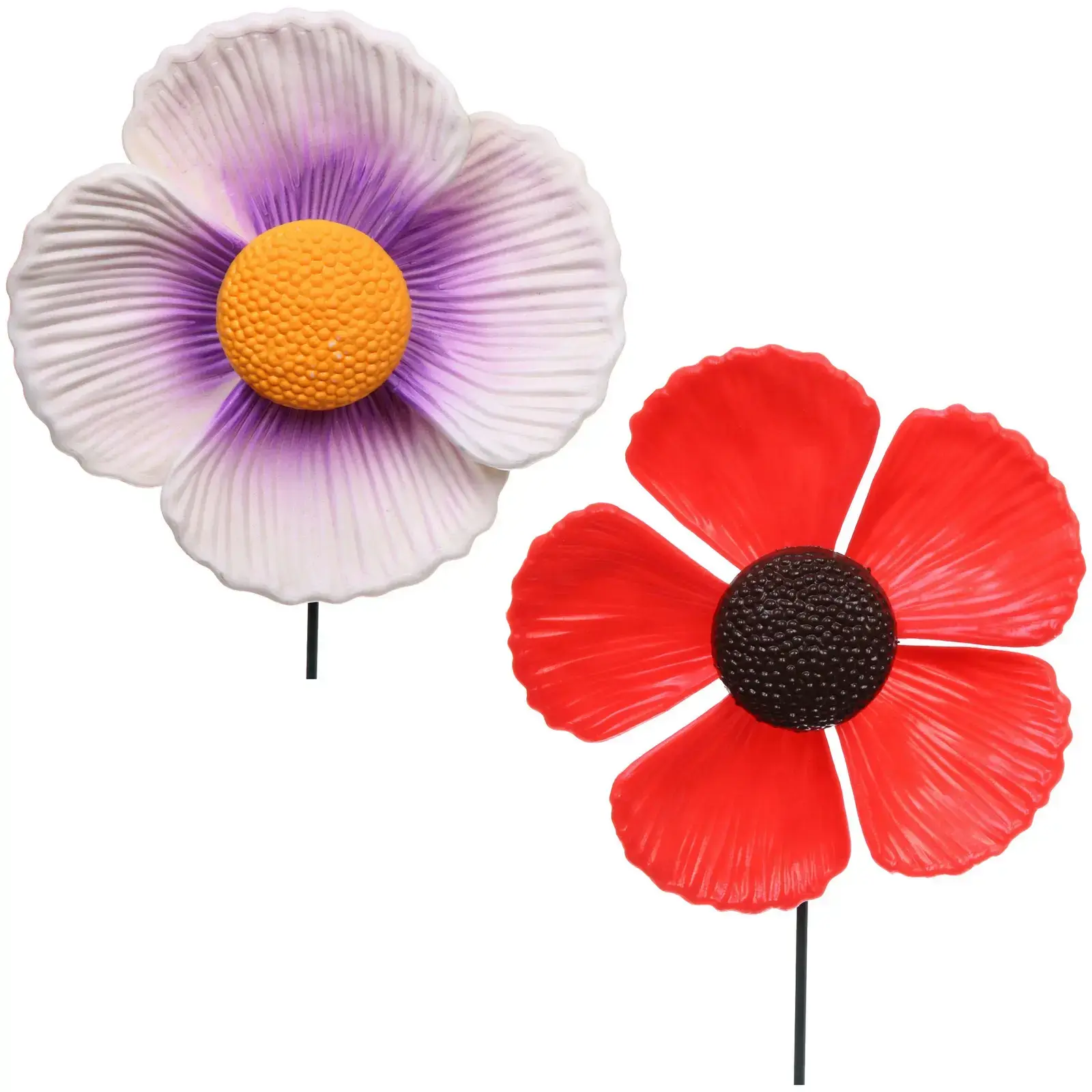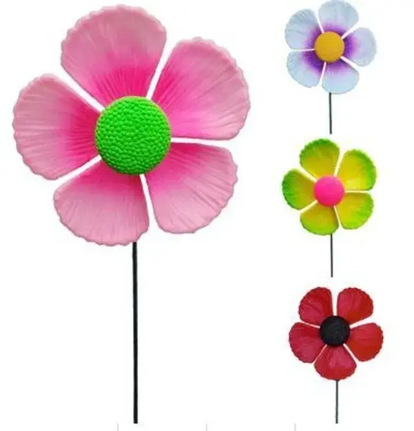 Высота спицы — 60 см, размер декоративной части — 12 см. Материалы: металл/пластик, устойчивые к влаге и выцветанию. Цветы представлены в разнообразных ярких вариациях (белый, фиолетовый, красный и другие), что позволяет органично вписать фигуру в любой садовый ансамбль.