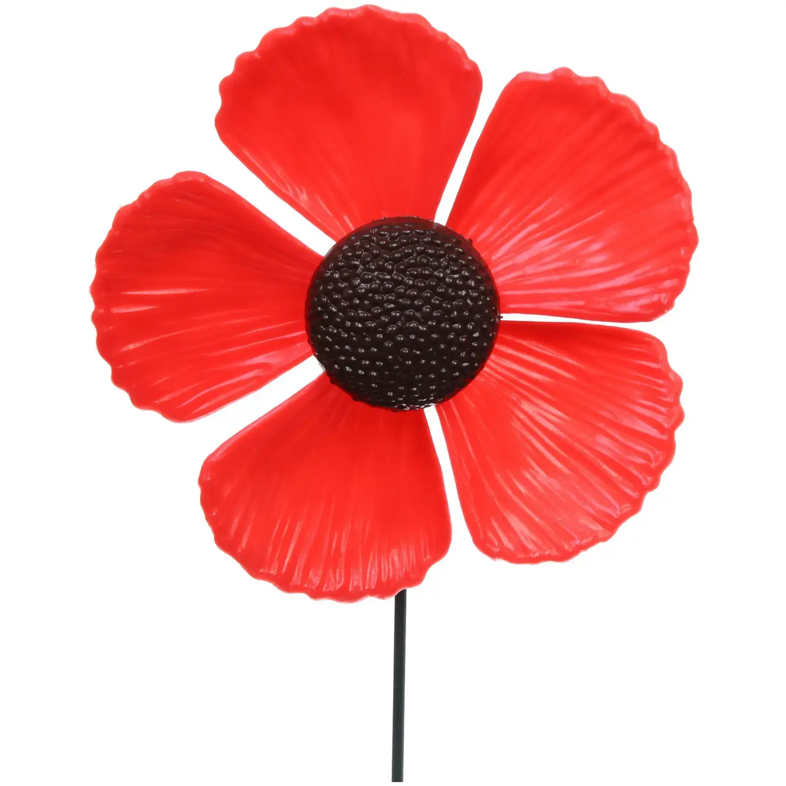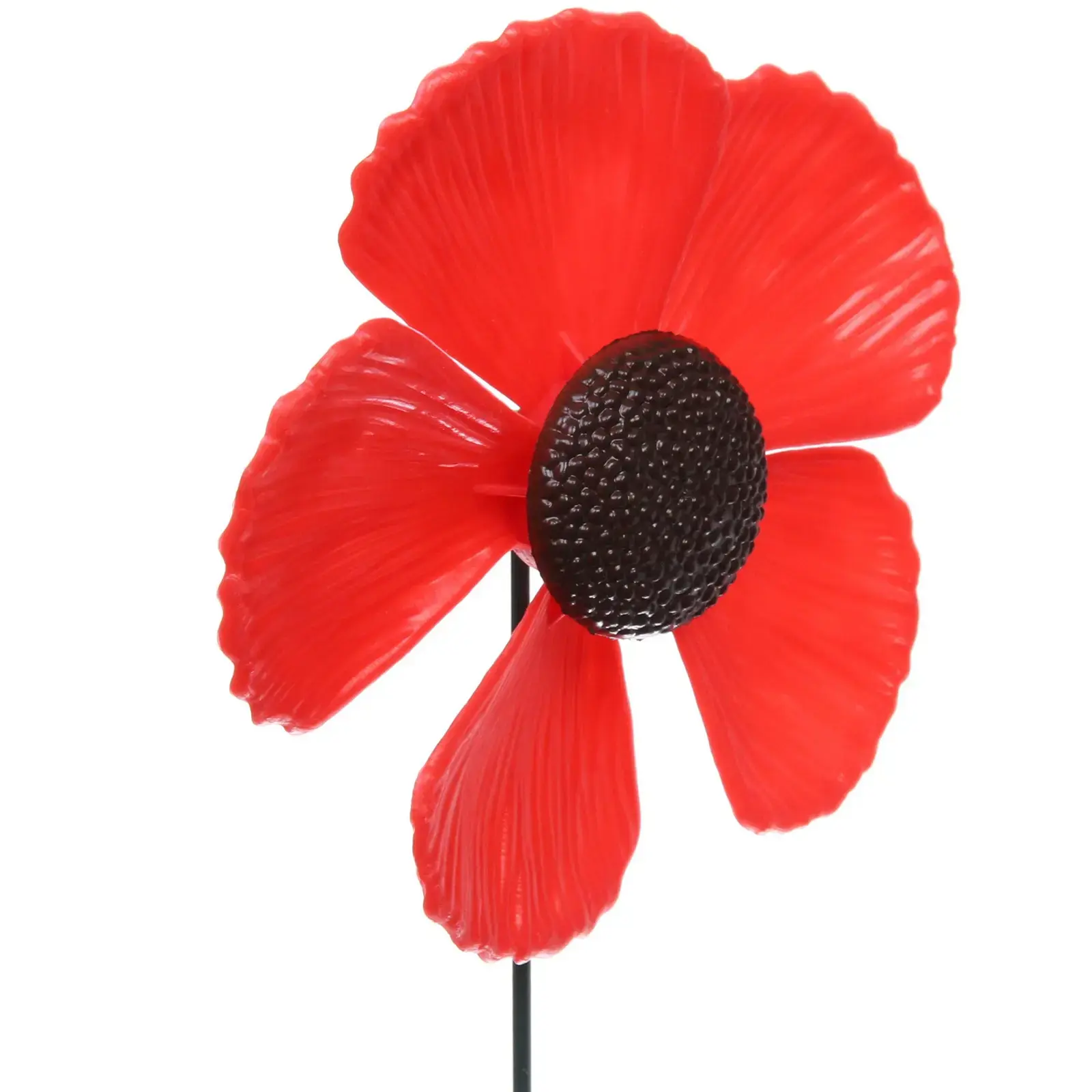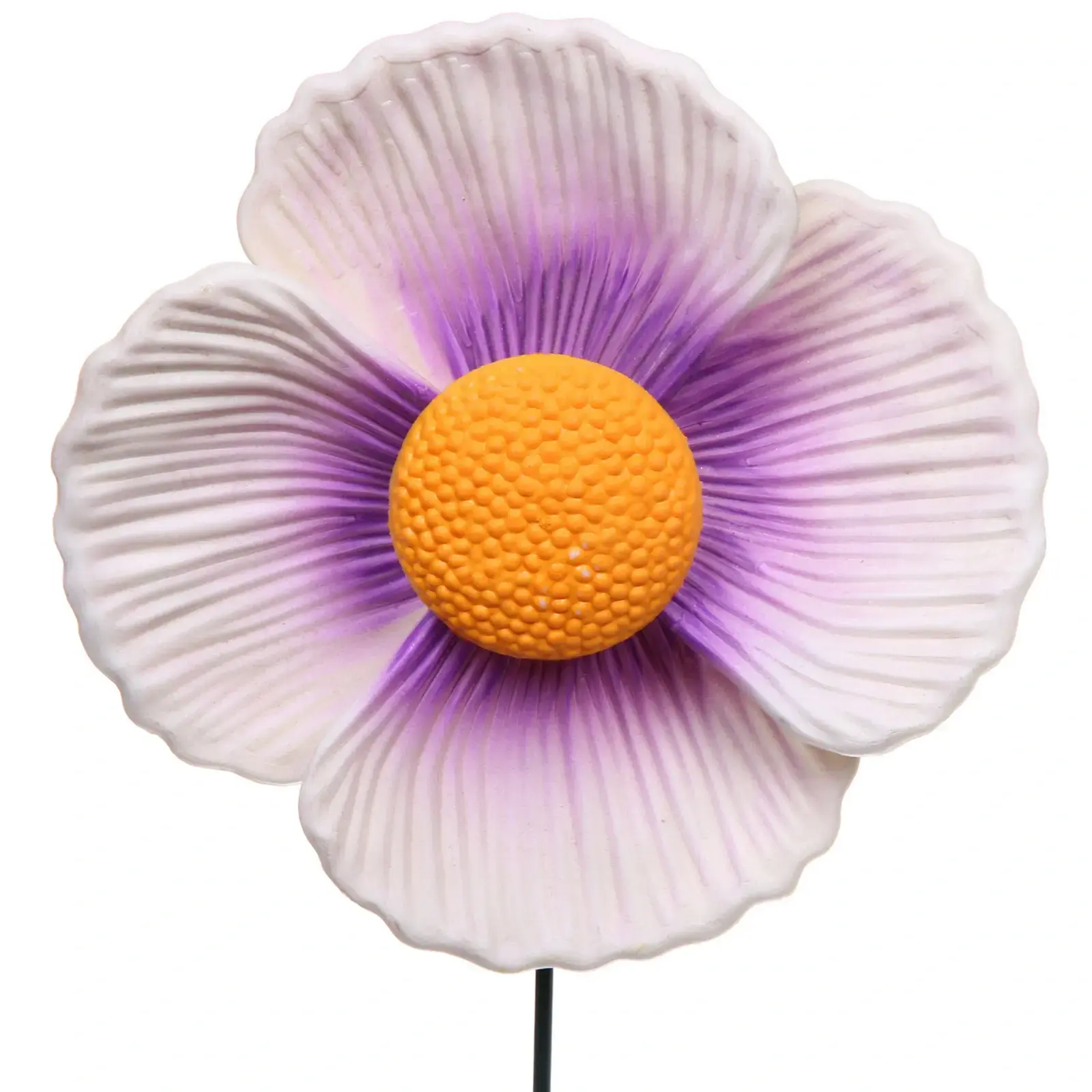 Высота спицы — 60 см, размер декоративной части — 12 см. Материалы: металл/пластик, устойчивые к влаге и выцветанию. Цветы представлены в разнообразных ярких вариациях (белый, фиолетовый, красный и другие), что позволяет органично вписать фигуру в любой садовый ансамбль.