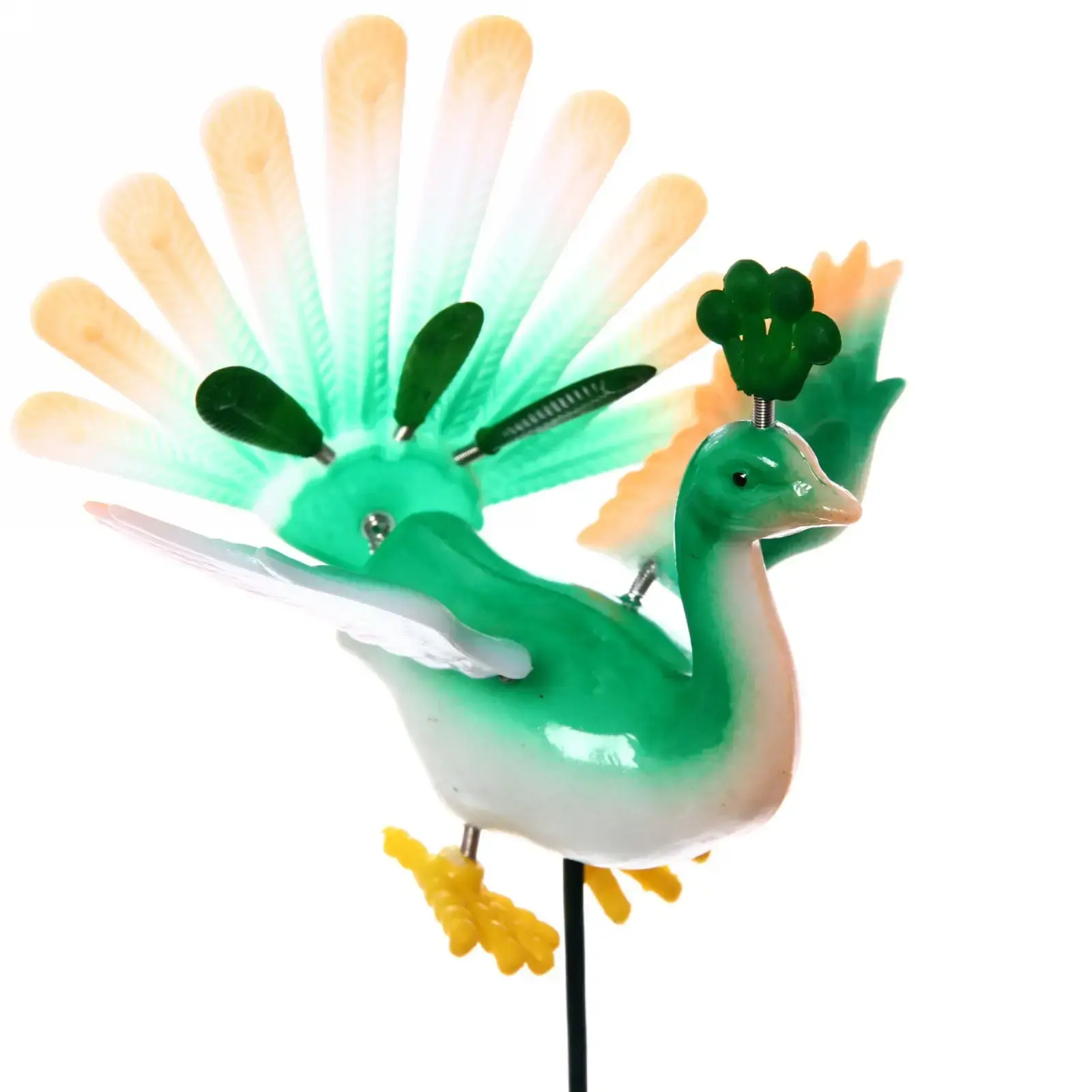 Размер — 10×40см. Фигура выполнена из качественного пластика и металла с глянцевым покрытием, детали оформлены в яркой палитре с градиентными переходами, имитирующими натуральное оперение павлина. Применяется как декор для сада, интерьера или в качестве оригинального подарка.