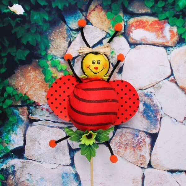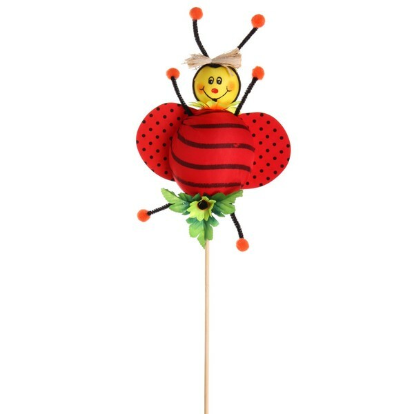 Размер фигурки составляет 15х27 см, что делает ее заметной, но не слишком громоздкой. Яркие красные и черные цвета, а также желтая голова с улыбающимся лицом создают дружелюбный и веселый образ. Фигурка дополнена зелеными листьями, что придает ей естественный вид. Она станет отличным подарком для любителей садоводства и декора.