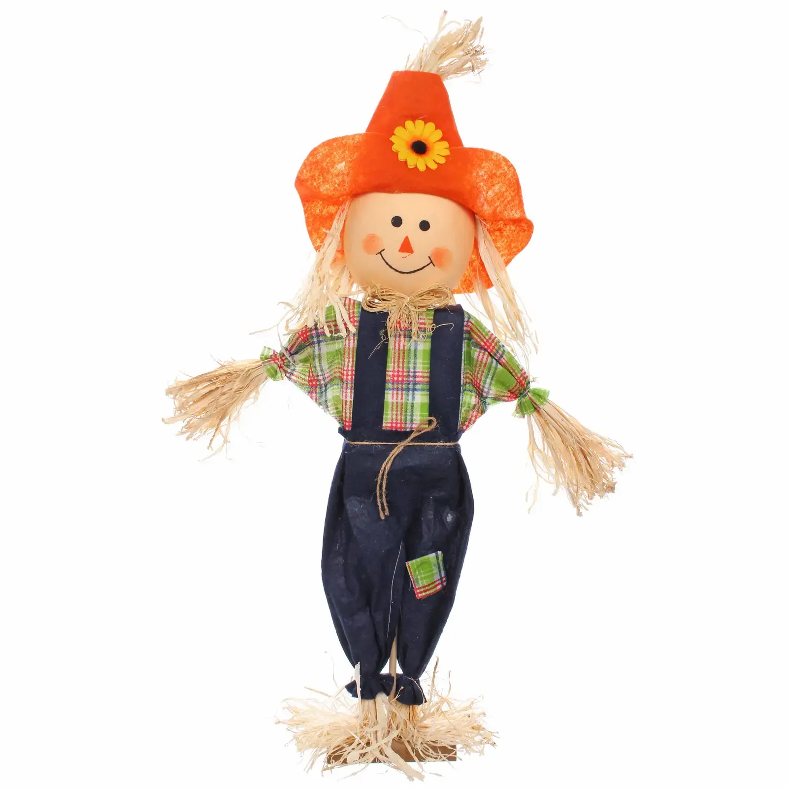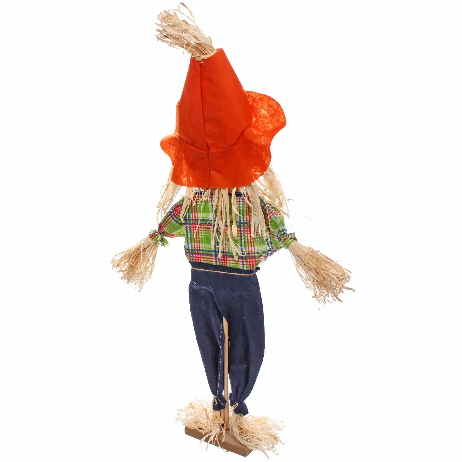 Фигура имеет высоту 50 см и выполнена из дерева, соломы и текстиля. Оранжевая шляпа с желтым цветком добавляет яркости и оригинальности. Клетчатая рубашка и синие брюки придают пугалу деревенский шарм. Это изделие станет не только украшением, но и символом уюта и тепла в вашем саду.