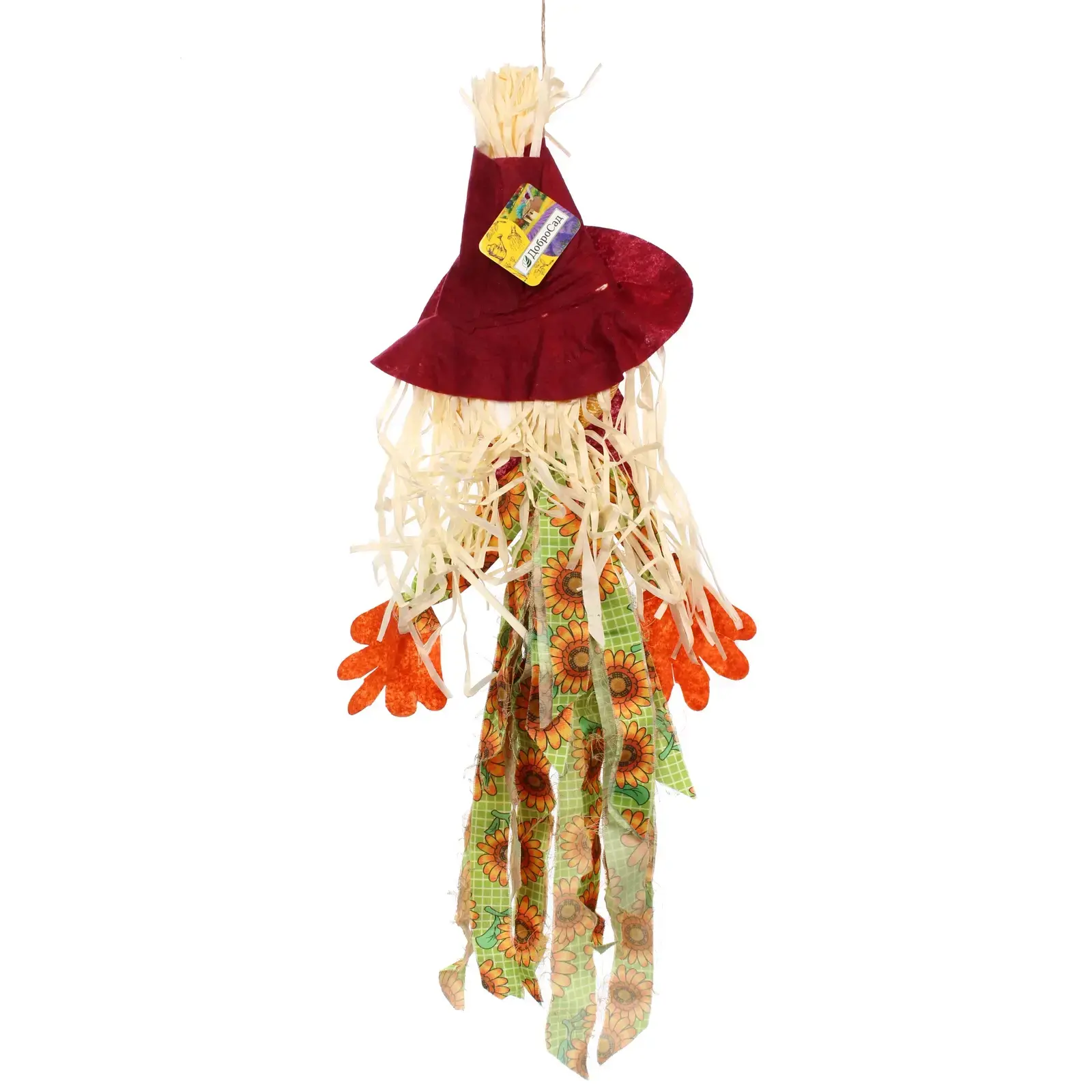Фигура выполнена из качественных материалов: дерева, соломы и текстиля, что обеспечивает долговечность и устойчивость к внешним условиям. Пугало можно использовать как в саду, так и в интерьере, создавая атмосферу праздника в любое время года. Оно идеально подходит для украшения на осенние праздники или как новогодний декор.