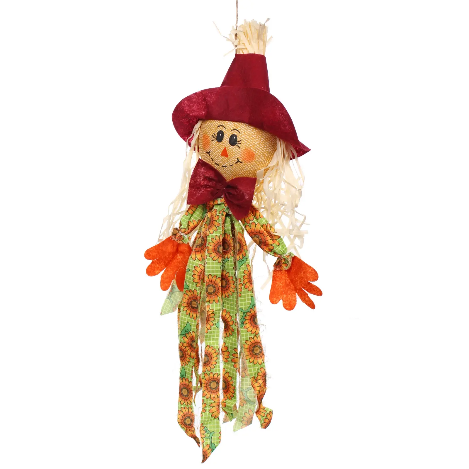 Размер фигурки составляет 50 см, что делает её заметной, но не слишком громоздкой. Бордовая шляпа и яркая одежда с рисунком подсолнечников добавляют шарма и делают её привлекательной для глаз. Фигура имеет округлую форму и выполнена с любовью к деталям, что подчеркивает её уникальность.