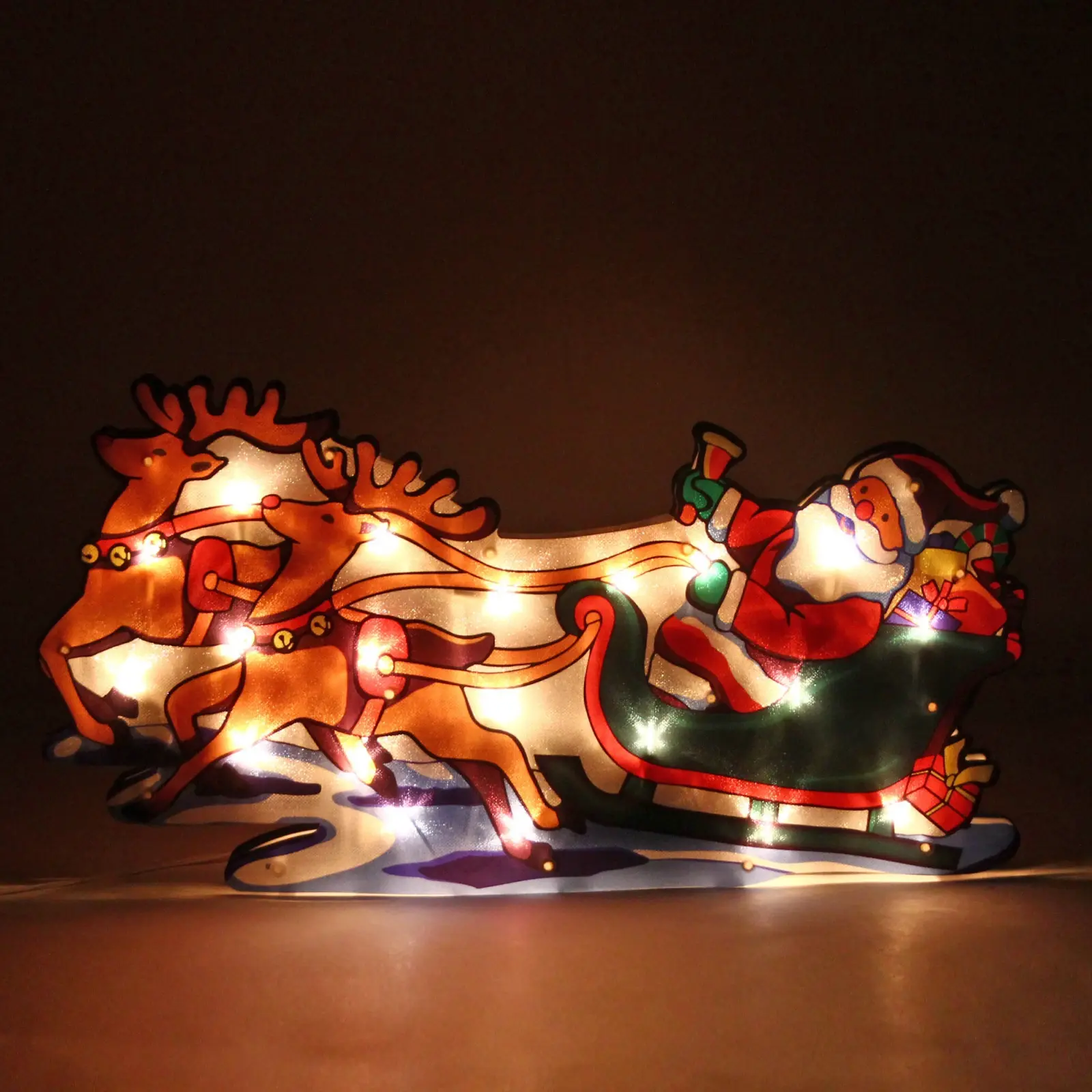 Эта светодиодная фигура выполнена из качественных материалов: металла и пластика, что обеспечивает ее долговечность и устойчивость к внешним условиям. Яркие цвета — красный, зеленый, коричневый и белый — делают ее заметной и привлекательной. Объемная конструкция с четкой прорисовкой деталей, включая подарки и оленей, добавляет реалистичности и очарования.