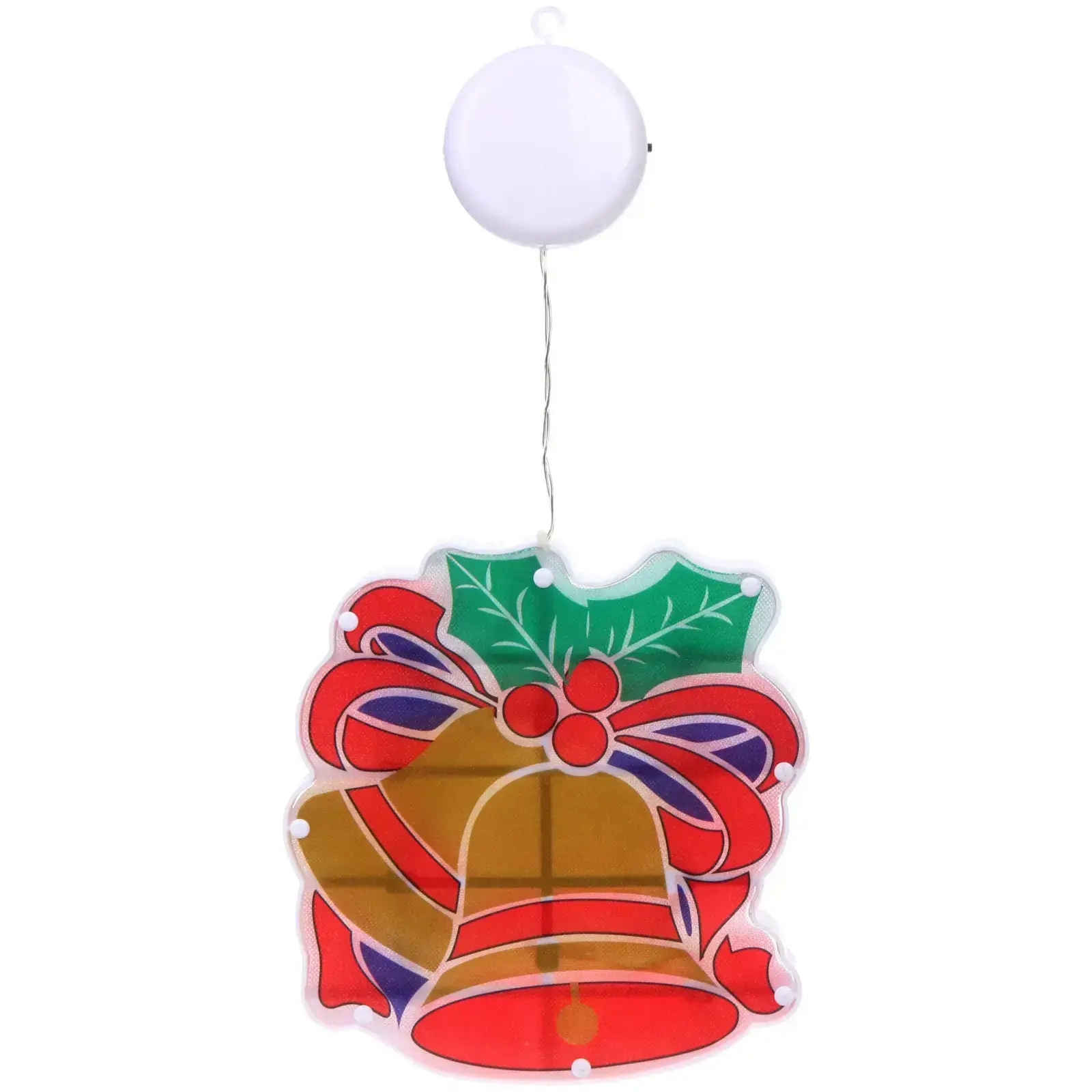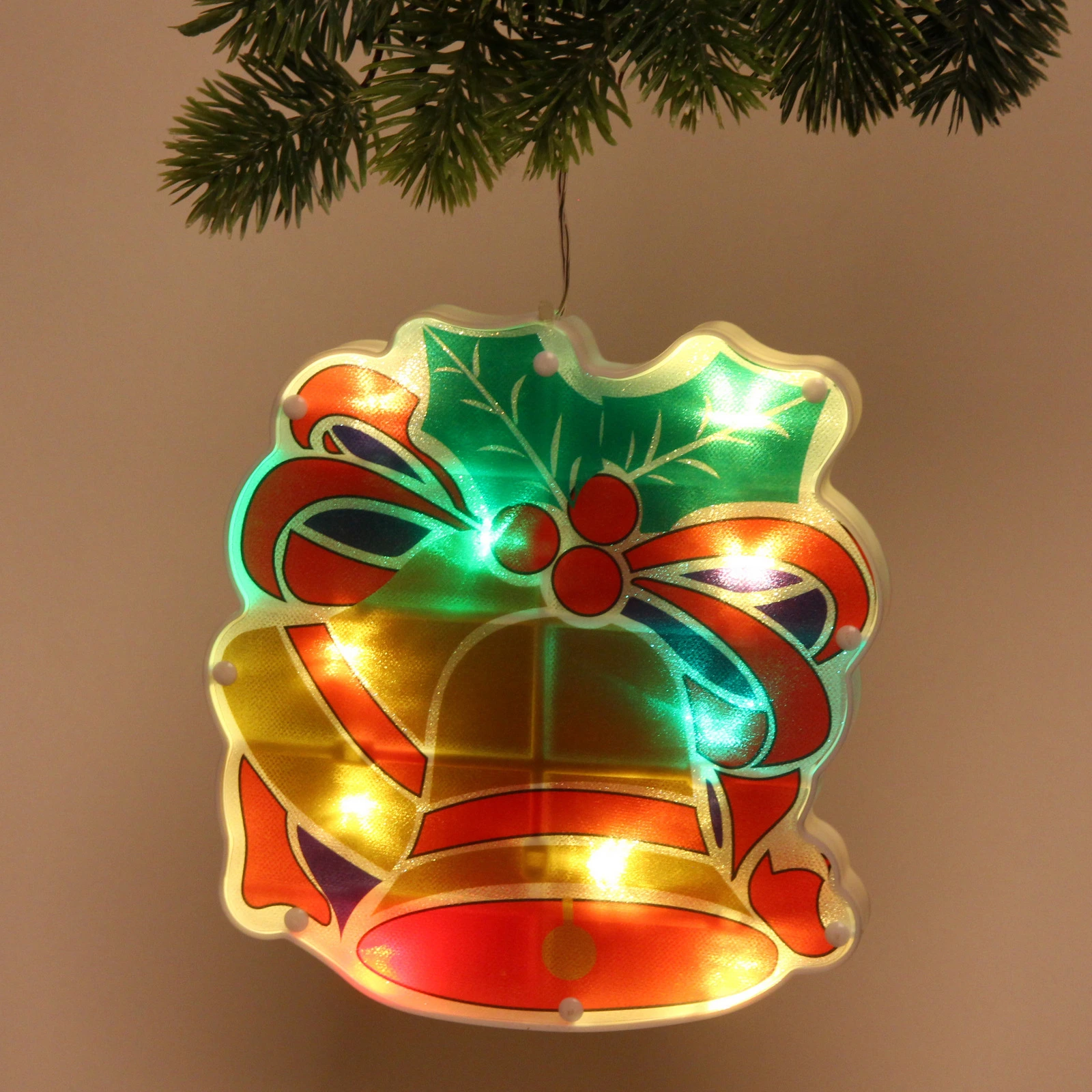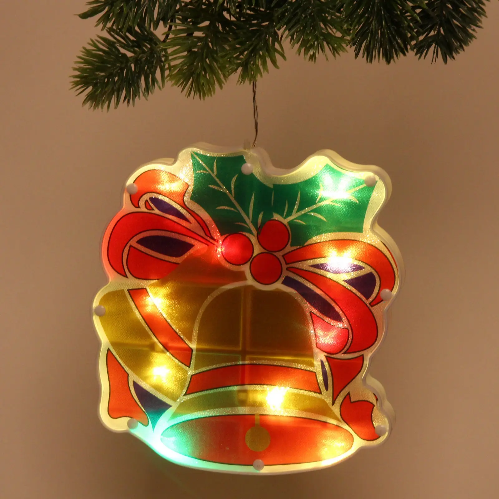 Фигура выполнена в форме колокольчика с элементами рождественского венка, такими как листья и ягоды. Она имеет округлую форму и украшена яркими цветами: красным, зеленым, желтым и синим. Колокольчик легко подвешивается благодаря специальной петле, что делает его удобным в использовании. Не упустите возможность добавить этот замечательный элемент декора в ваш праздничный арсенал!