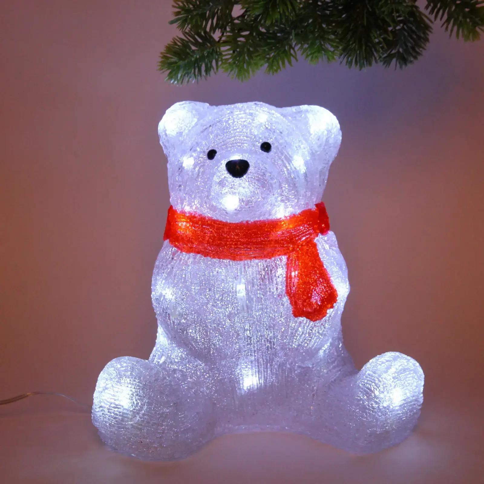 Фигура «Мишка» выполнена из акрила и металла, что делает её легкой и устойчивой. Она подходит для использования как в помещении, так и на улице, благодаря авторежиму, который позволяет ей автоматически включаться и выключаться. Это делает её идеальным выбором для тех, кто ценит комфорт и удобство в праздничных приготовлениях.
